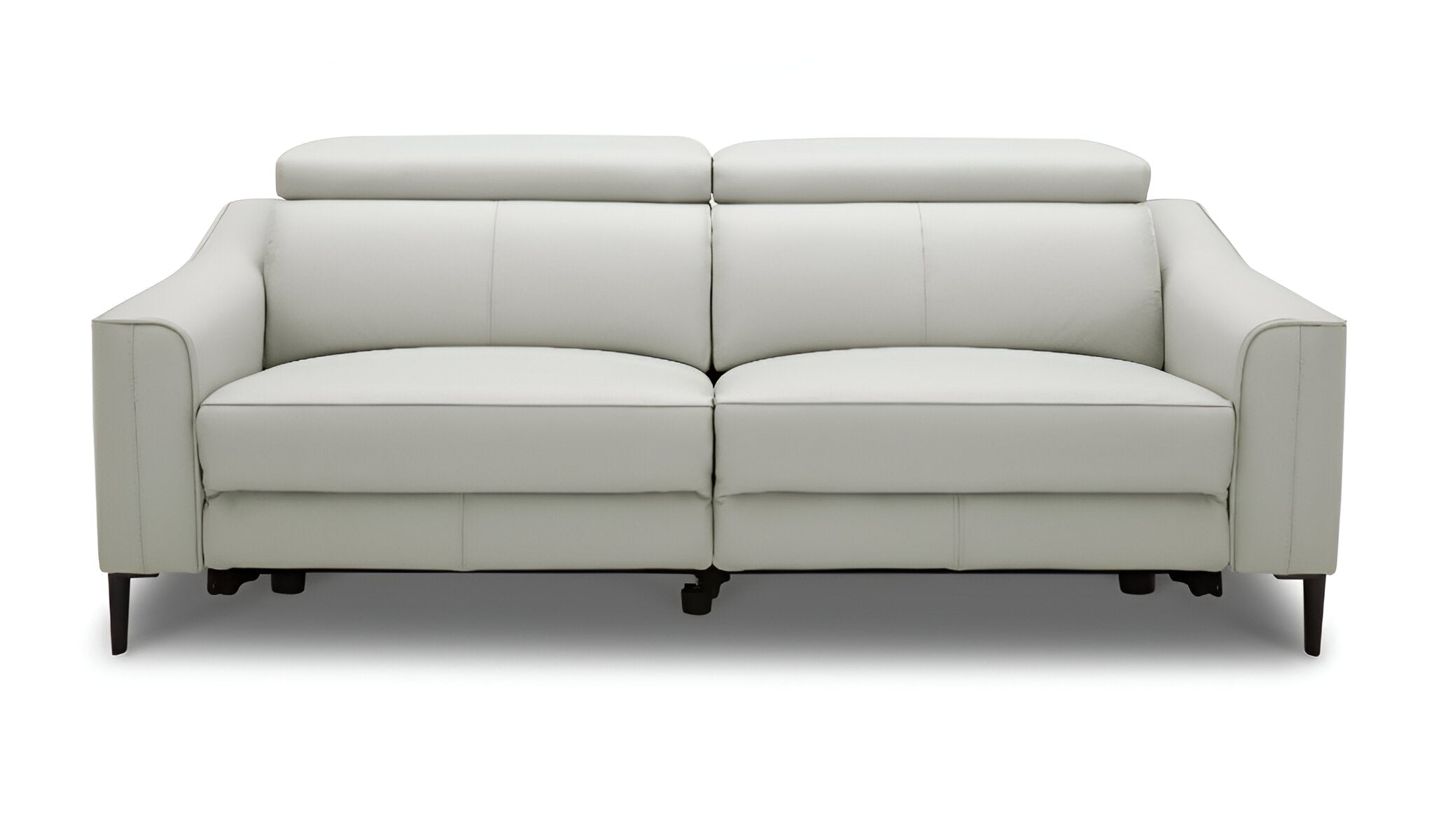 - Contemporary gray leather sofa with power reclining feature.