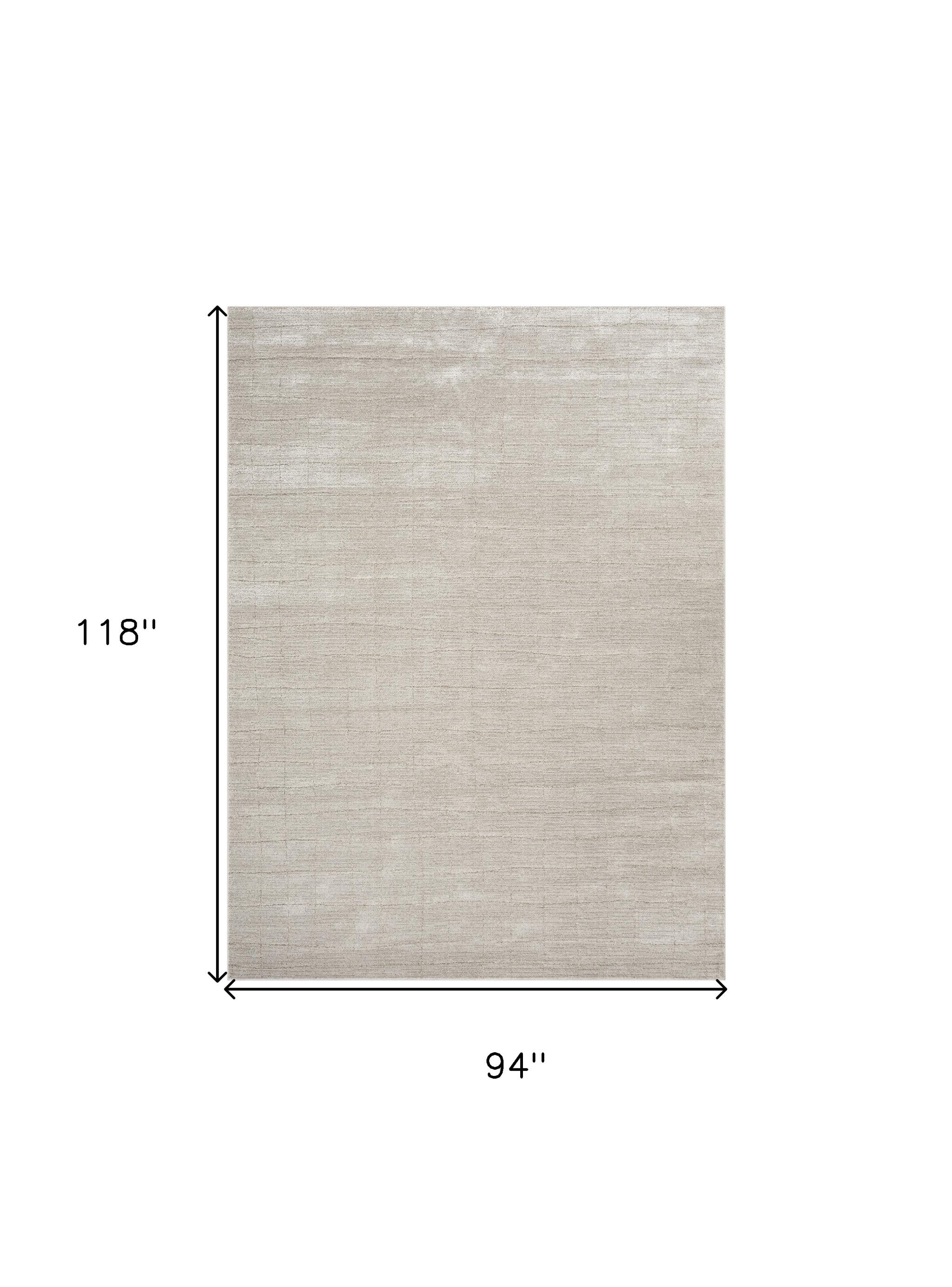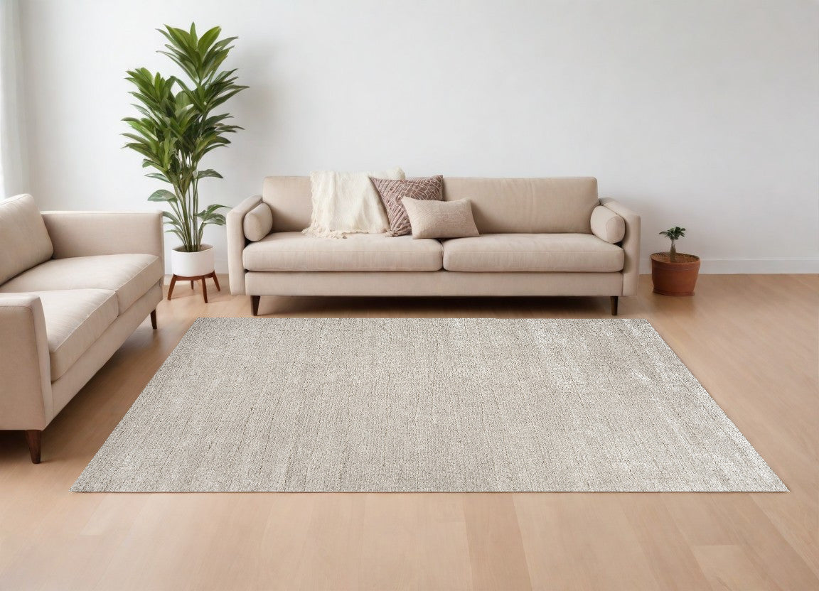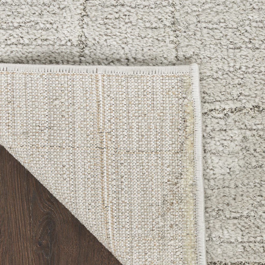 - Contemporary beige and ivory area rug, machine-made with high-low construction.