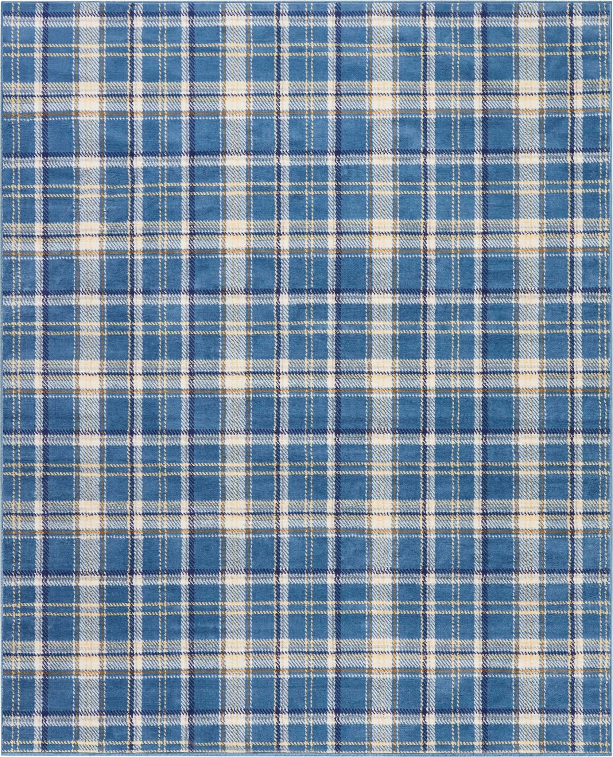 - Contemporary blue and beige area rug made of durable polypropylene material.