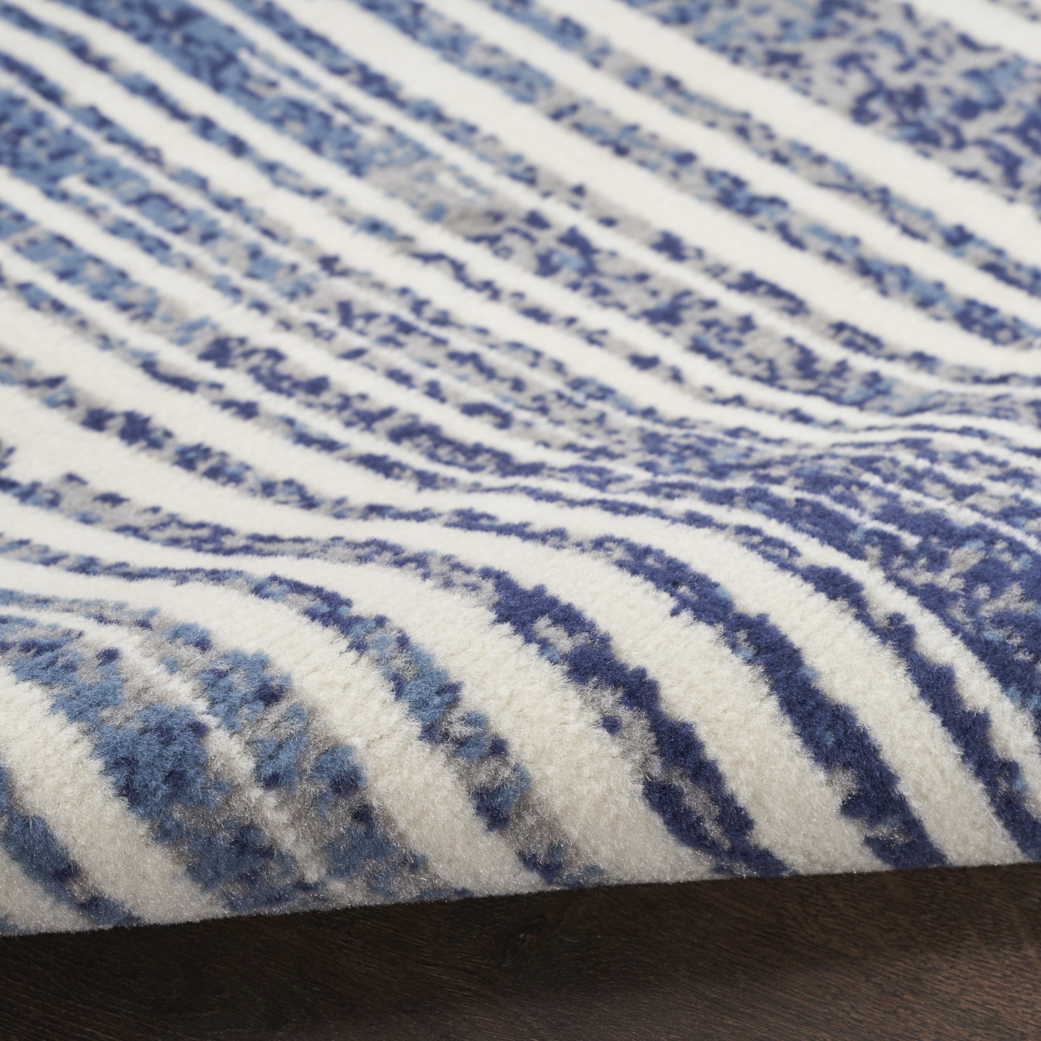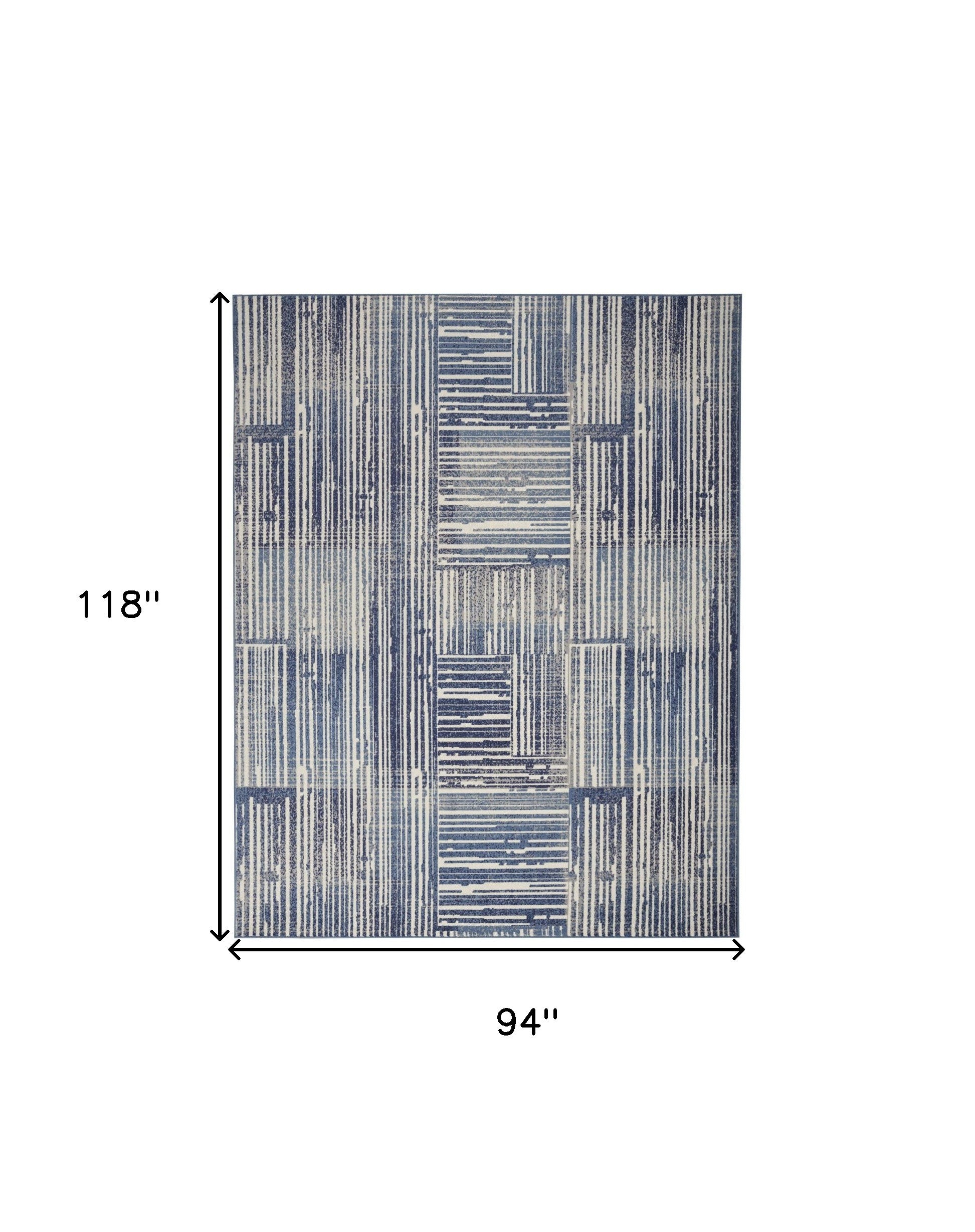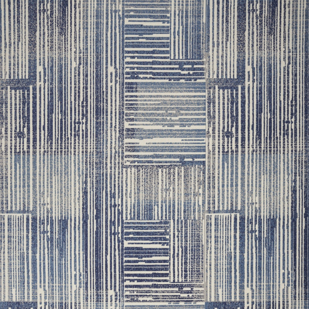 - Modern blue and gray area rug made of durable polypropylene material.