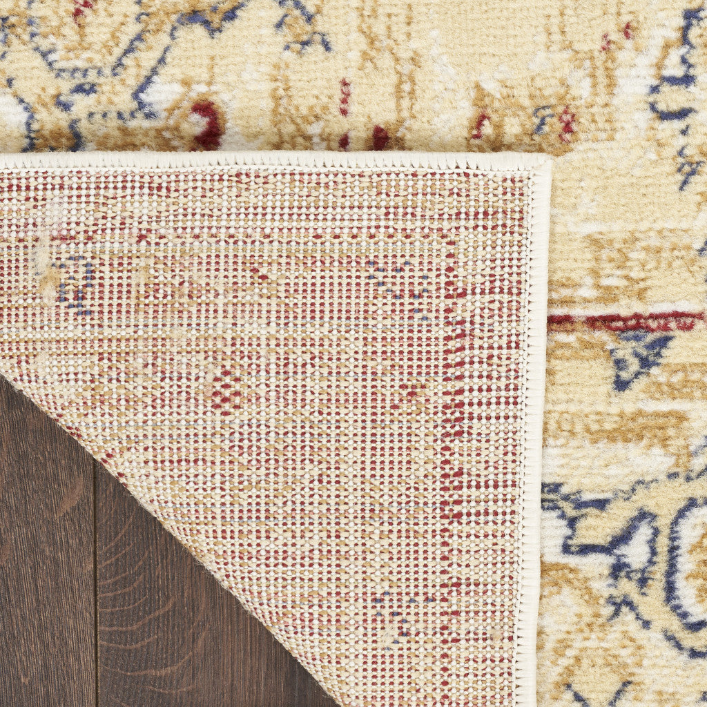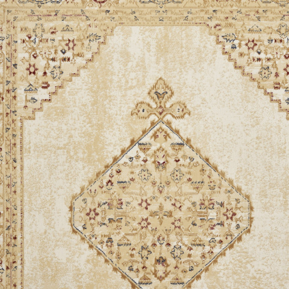 - Traditional beige and ivory area rug made of durable polypropylene, easy to clean with regular vacuuming.