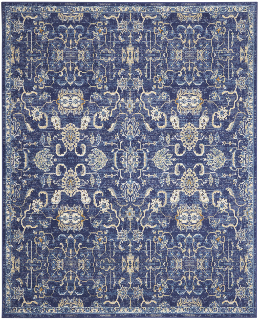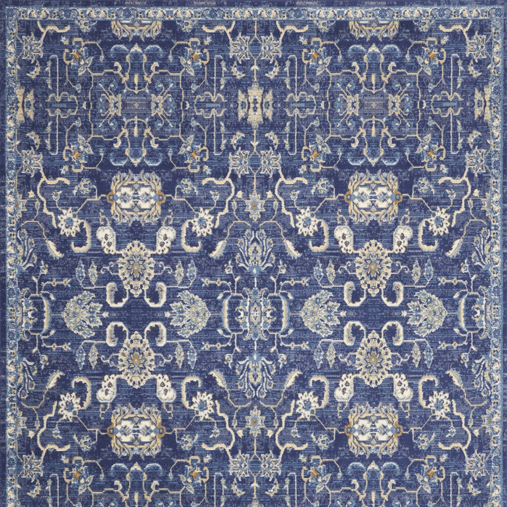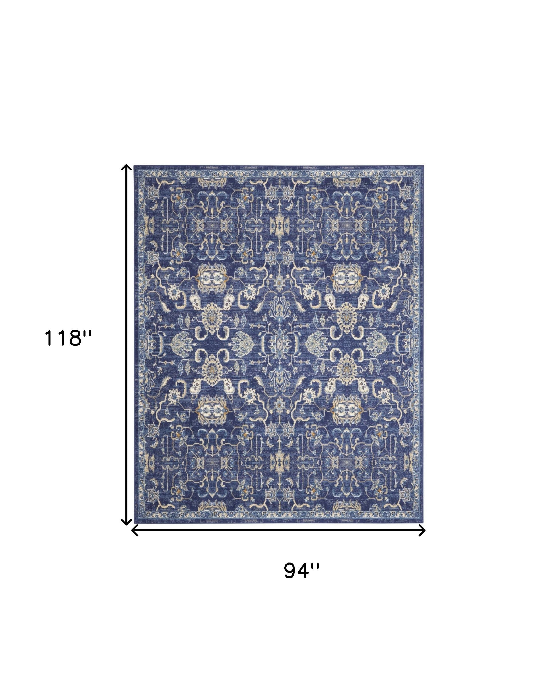 - Machine made area rug in blue and beige transitional style, easy to clean with vacuum.