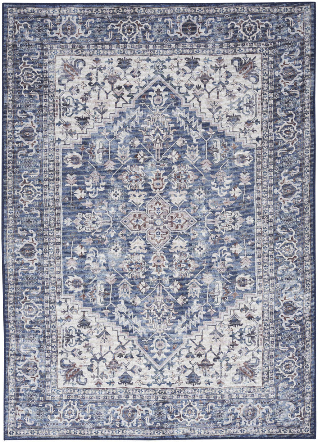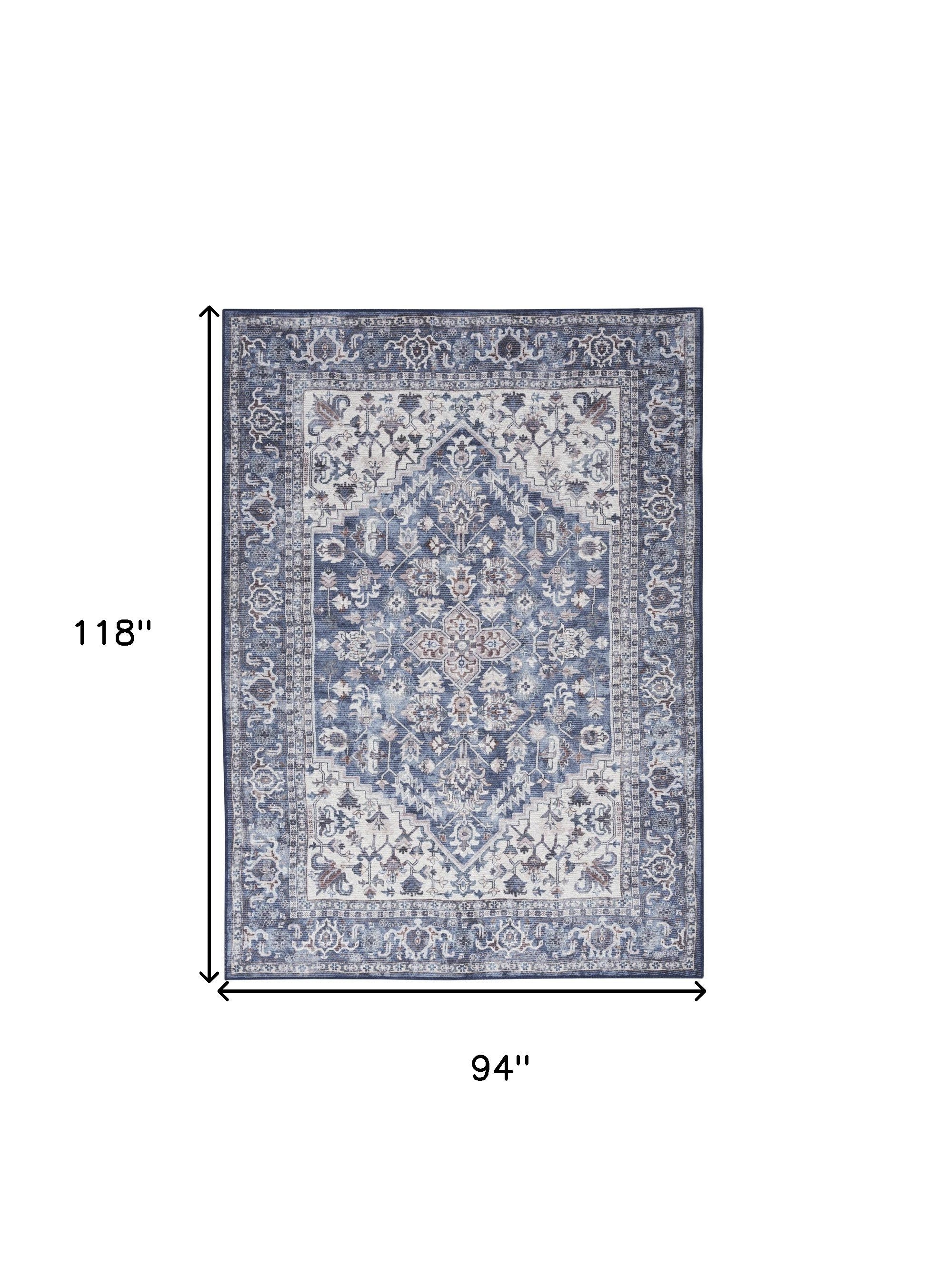 - Features a soft, bohemian design aesthetic with a distressed floral medallion pattern in navy blue, ivory, and gray.