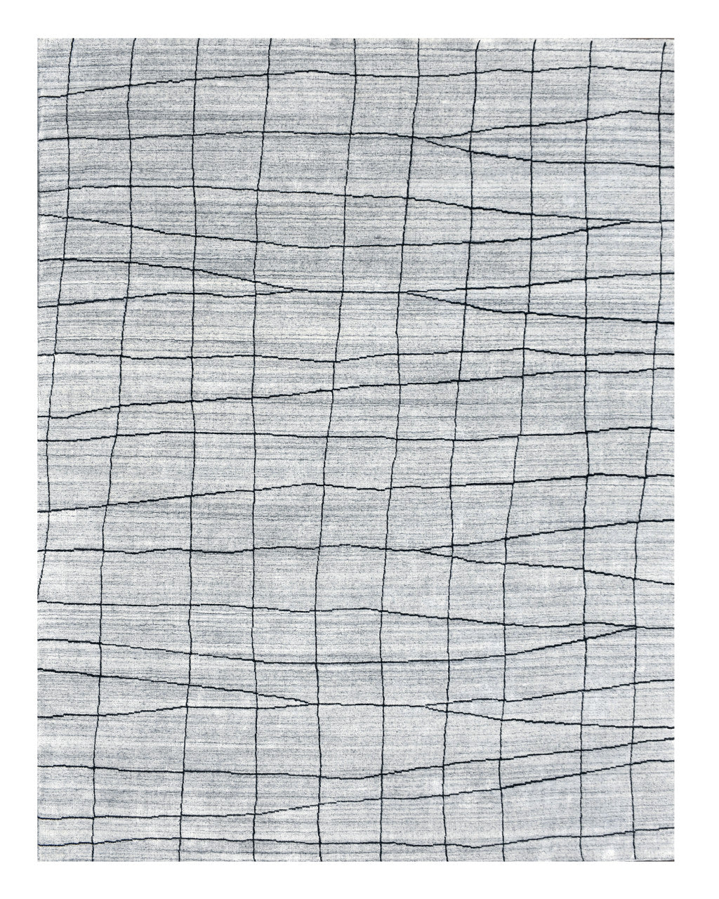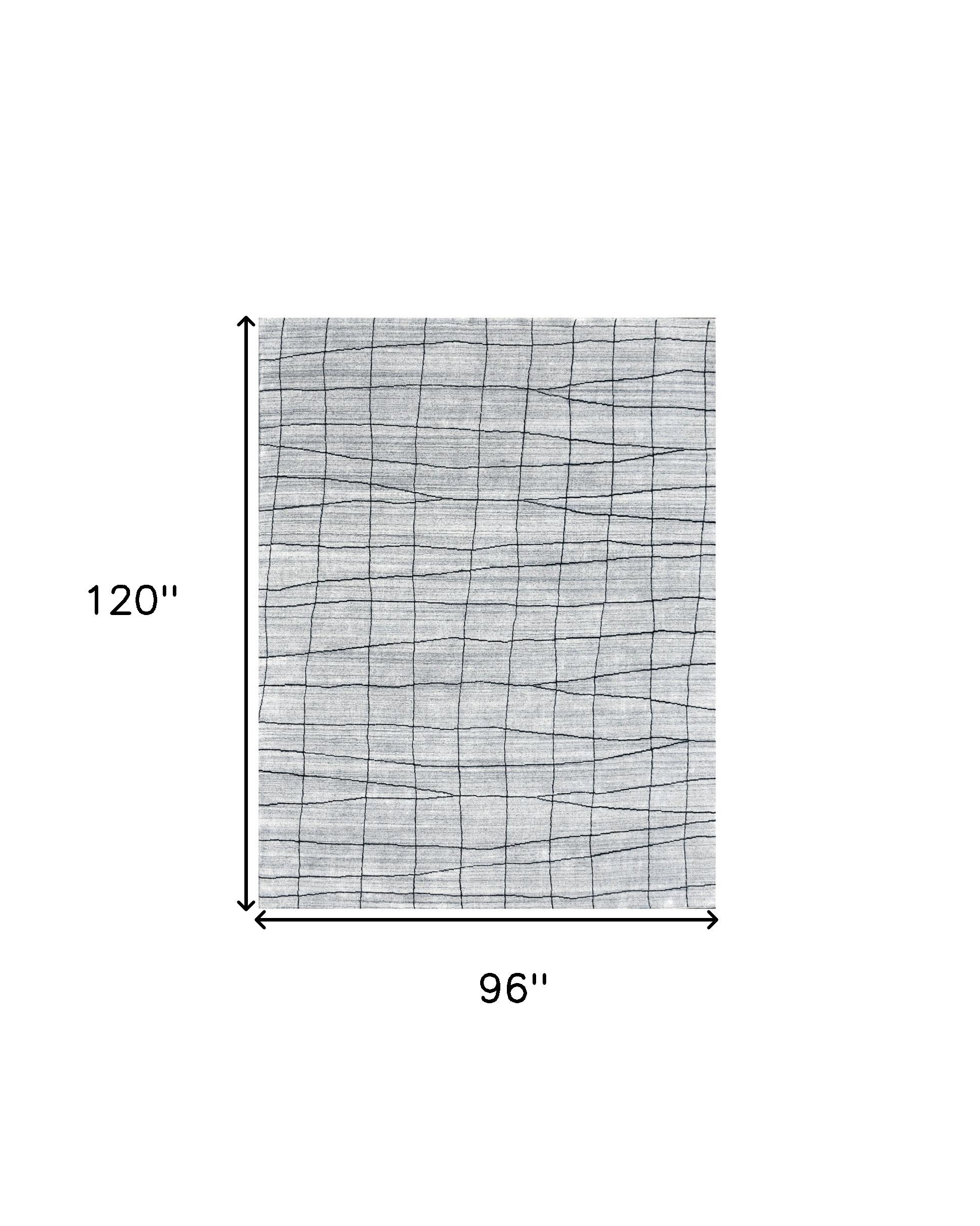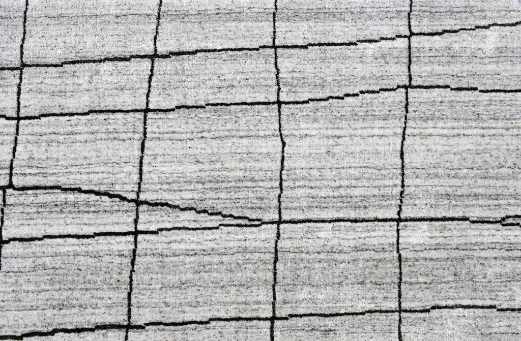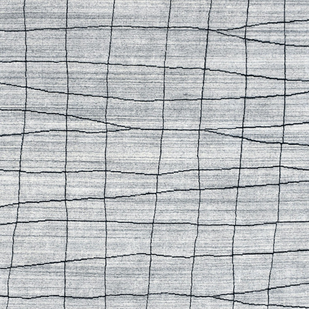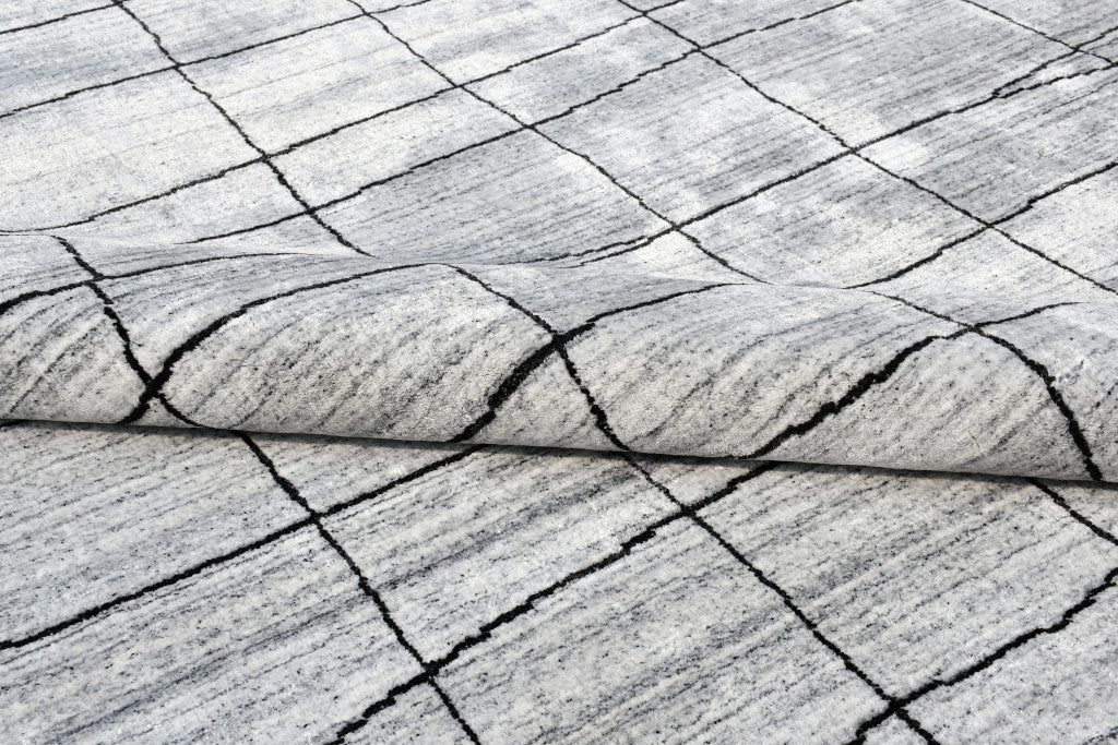 - Hand-woven wool blend area rug in modern and chic grey and black abstract geometric grid design.
