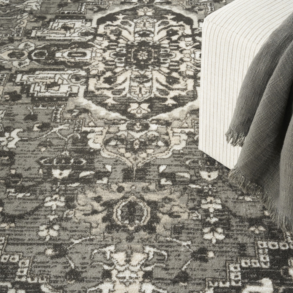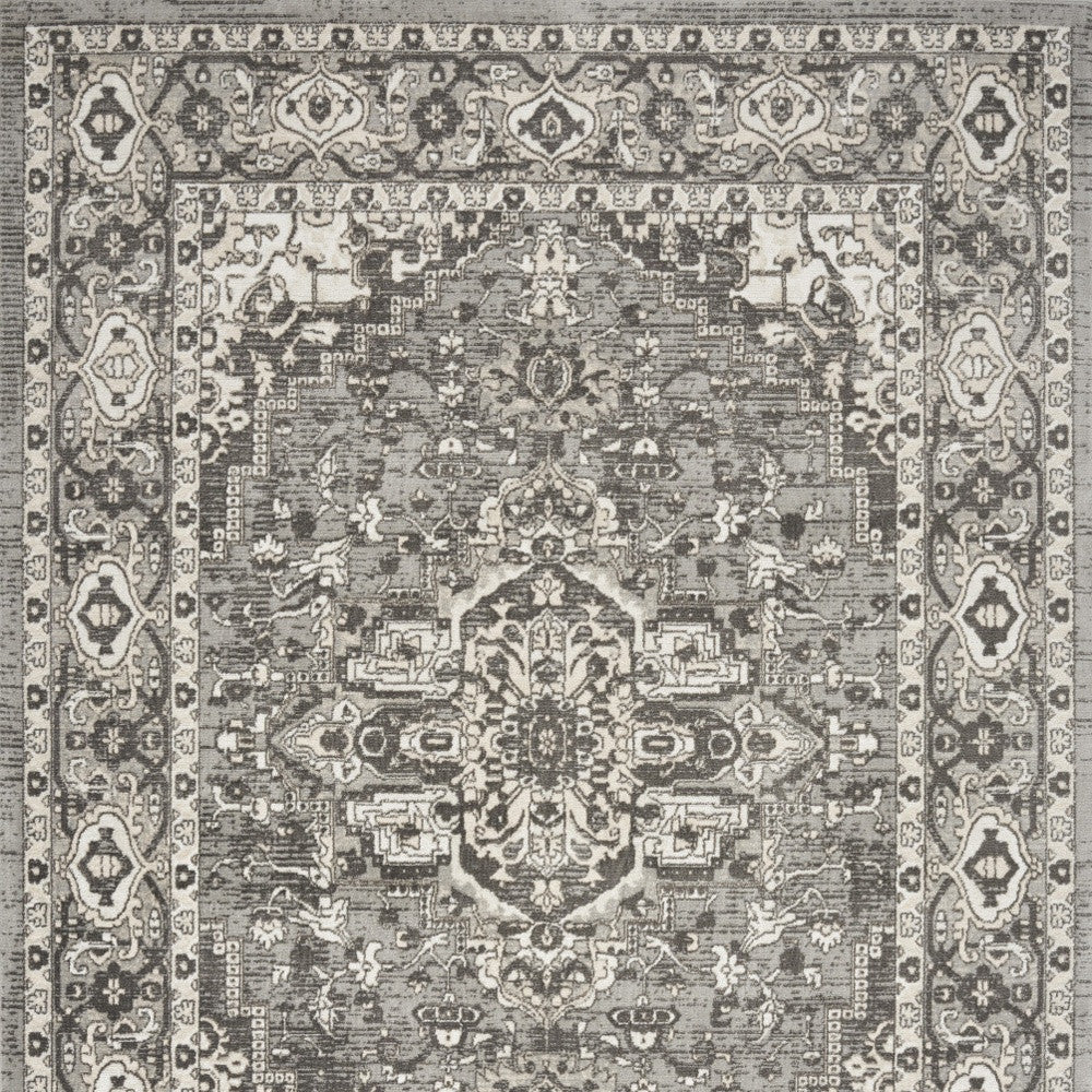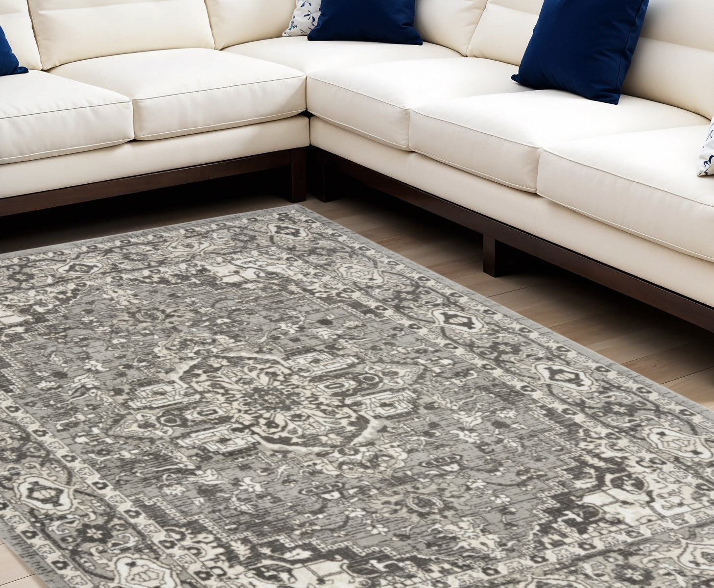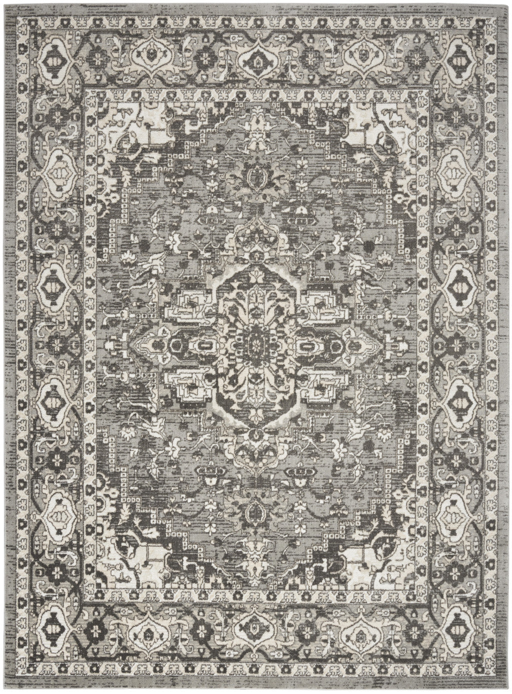 - Traditional style area rug in elegant gray and ivory color scheme, made with a durable polypropylene and polyester blend.