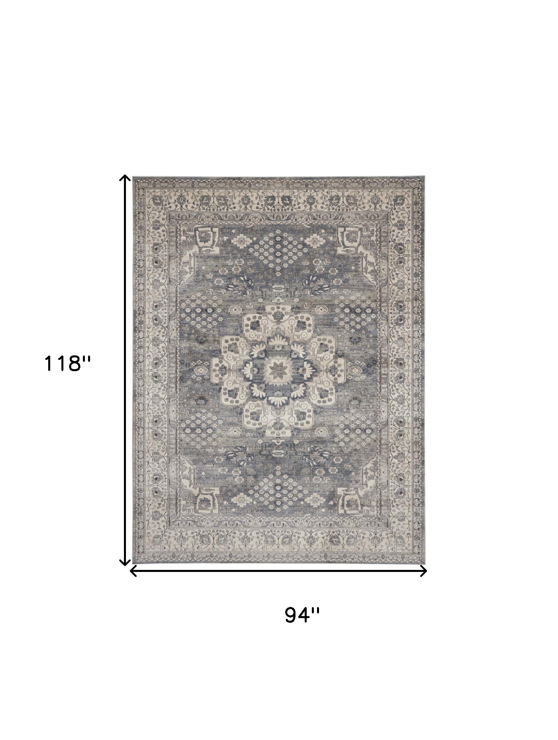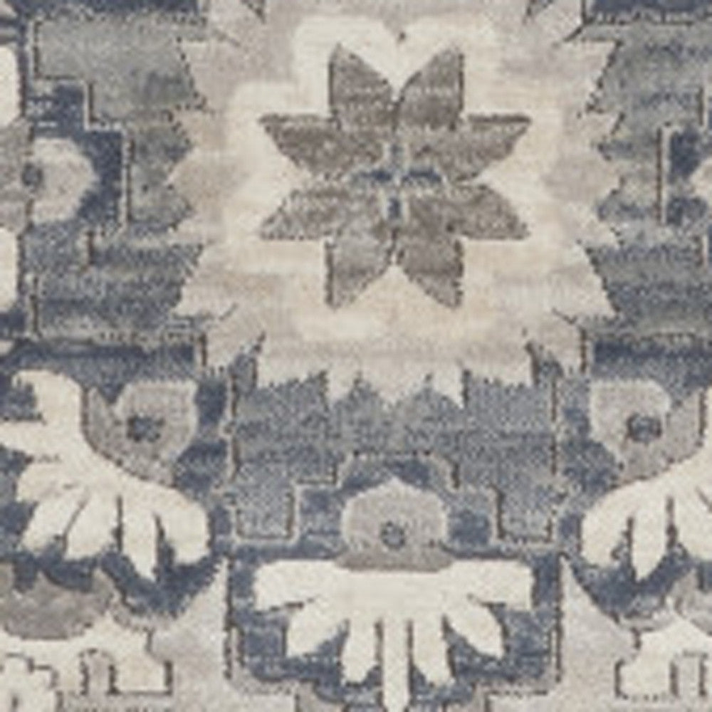 - Gray and ivory traditional style rug crafted from polypropylene and polyester blend.