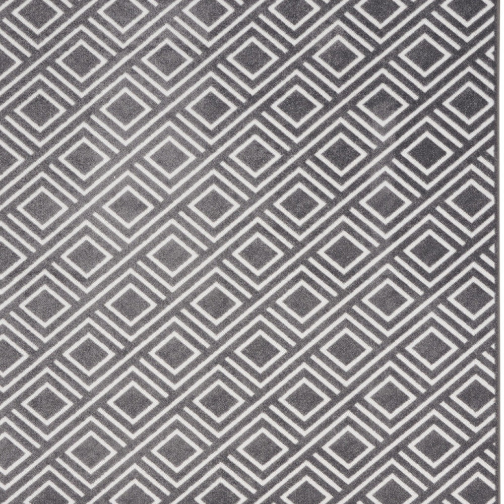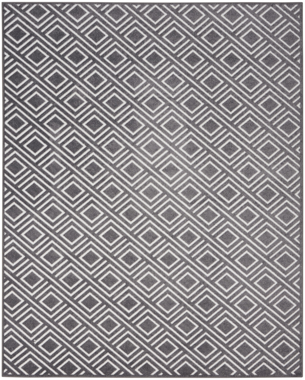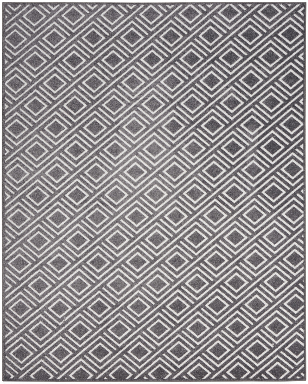 - machine-made gray area rug with modern style, made of polypropylene and easy to care for by vacuuming without a beater bar/rotating brush.