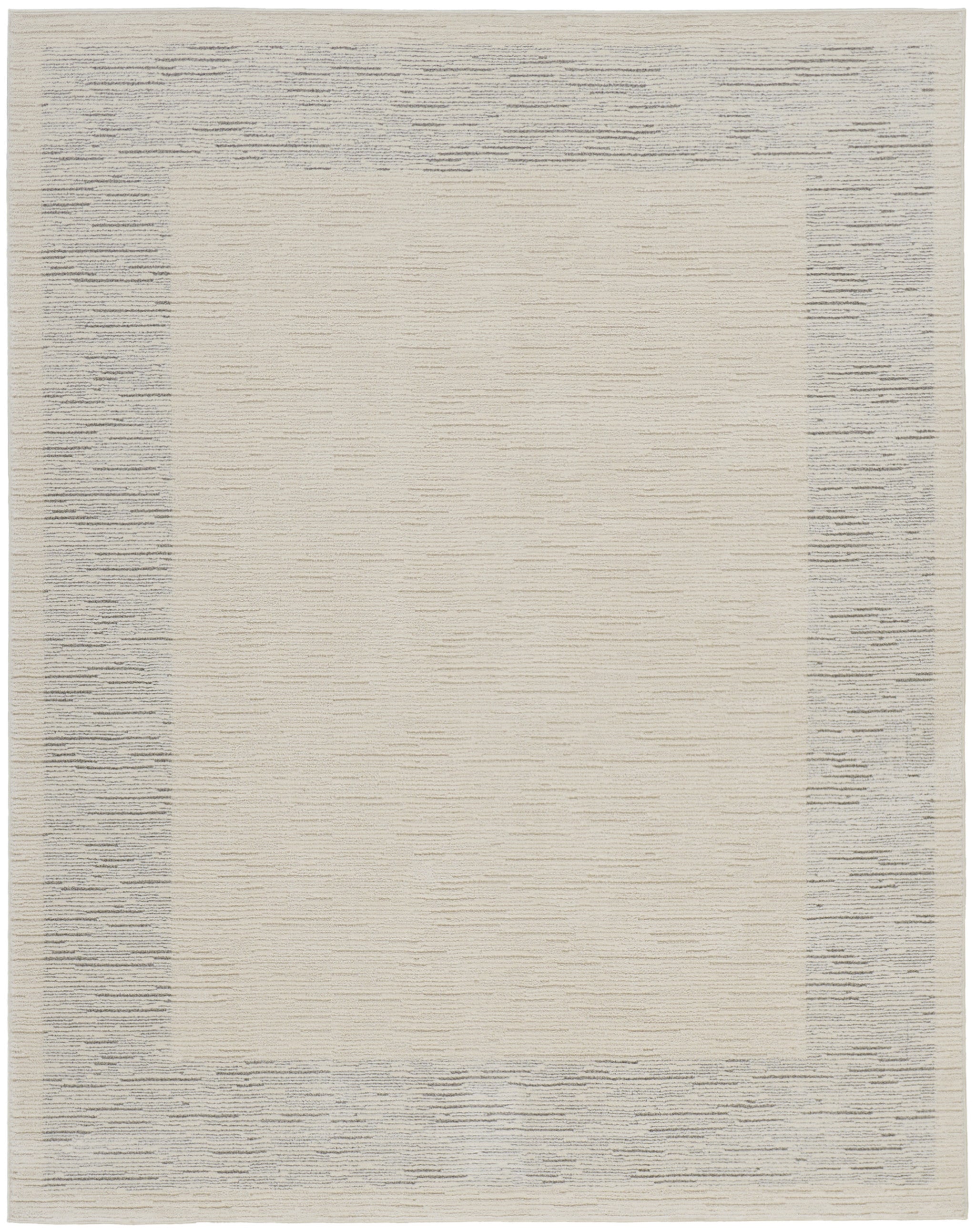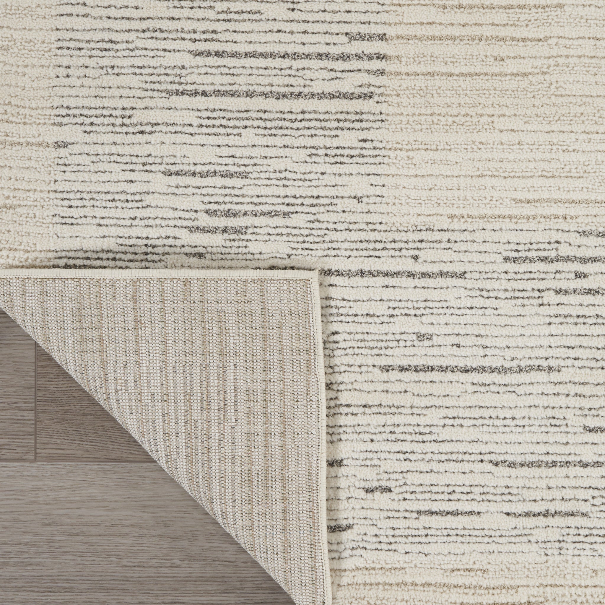 - Contemporary ivory and gray area rug with a machine-made construction.