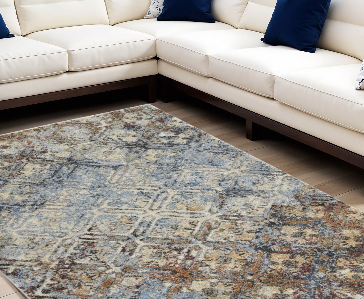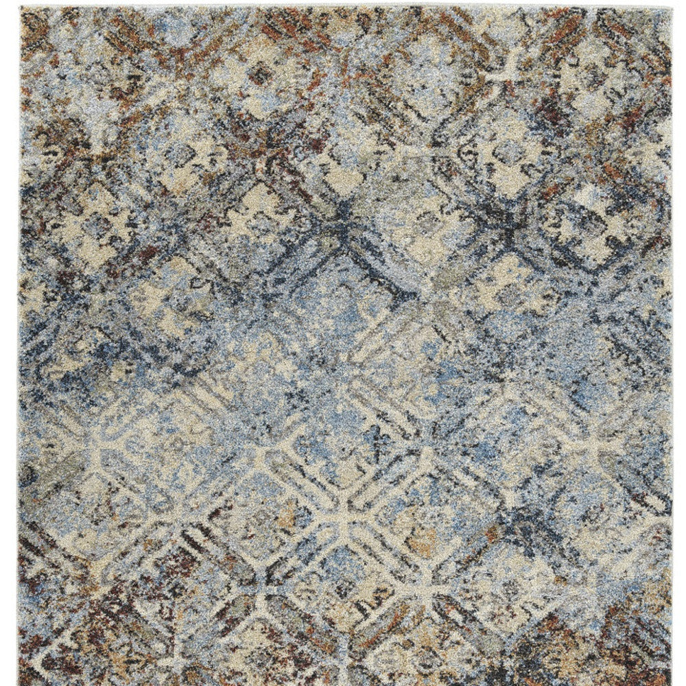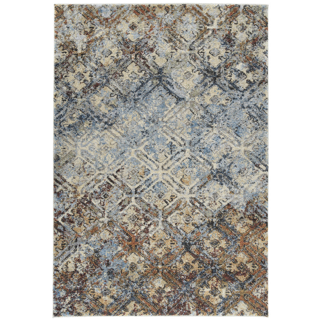 - Features an updated and modern geometric diamond, abstract and distressed design in shades of brown, cream, blue, and gray.