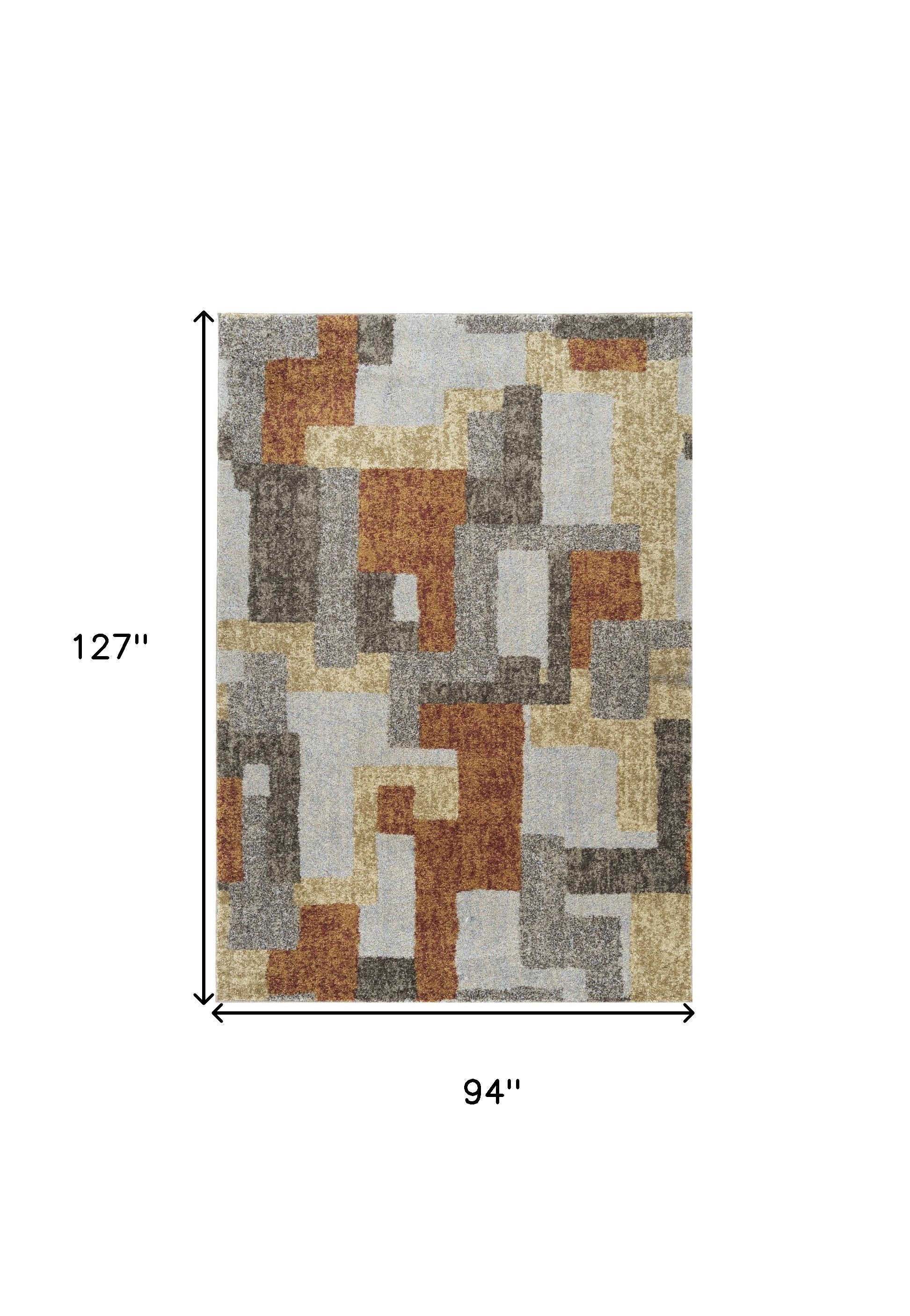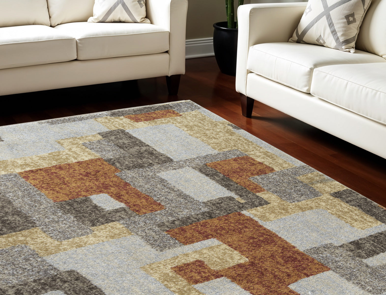 - Features an updated and modern geometric abstract design in shades of ivory, gray, silver, gold and brown.