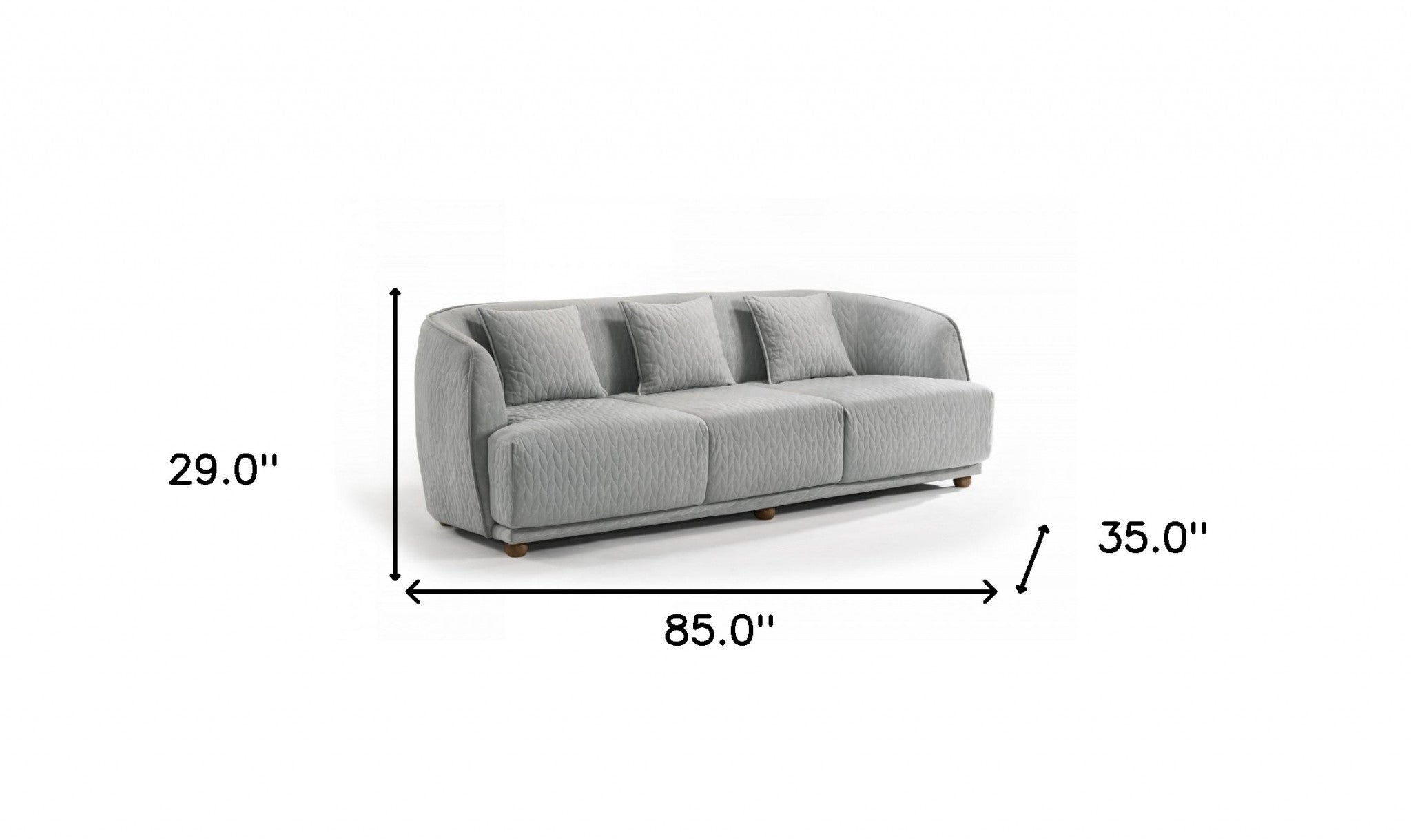 - Modern gray sofa with geometric upholstery and solid wood legs.