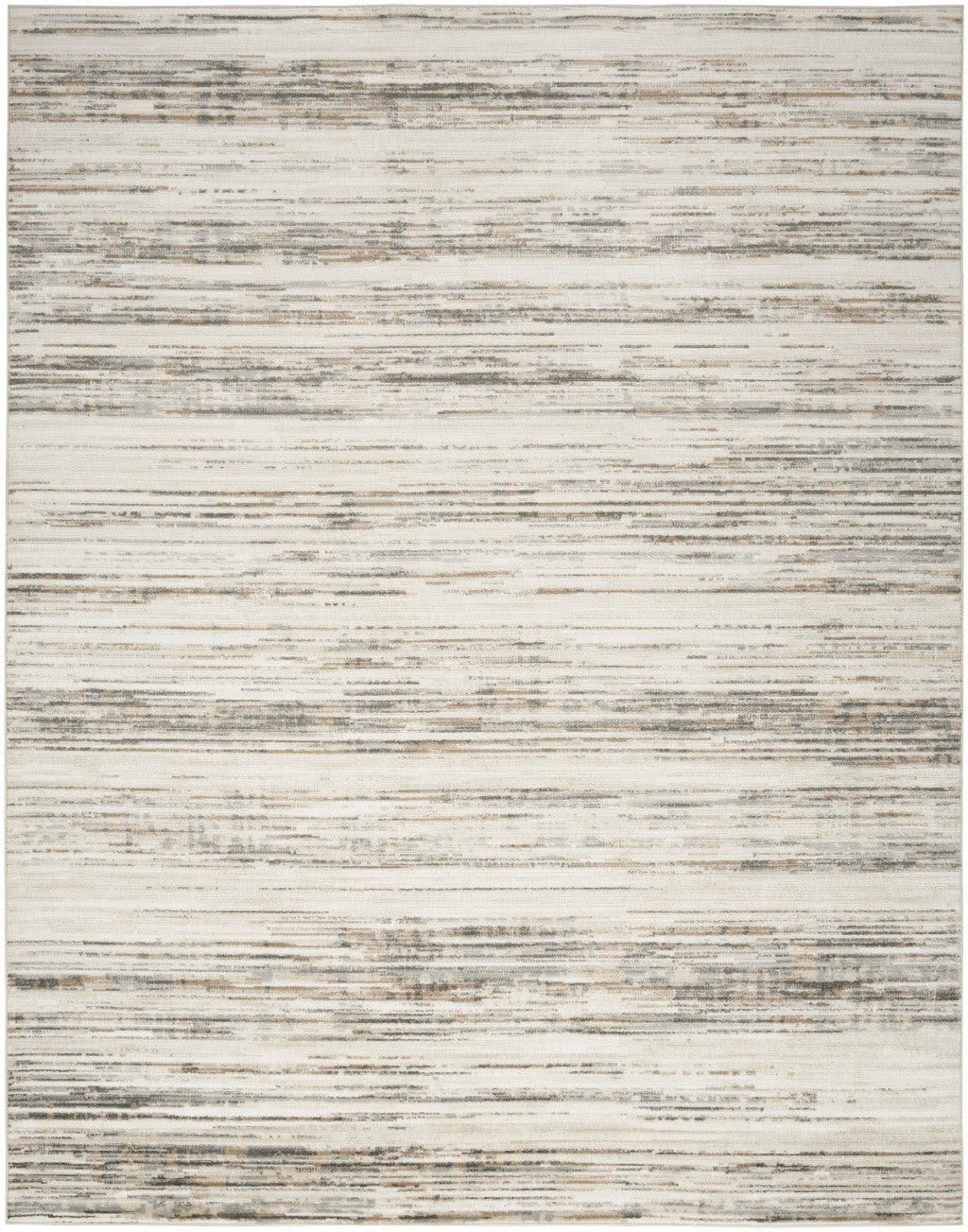 - Modern style cream area rug with a high-low construction made from synthetic material.