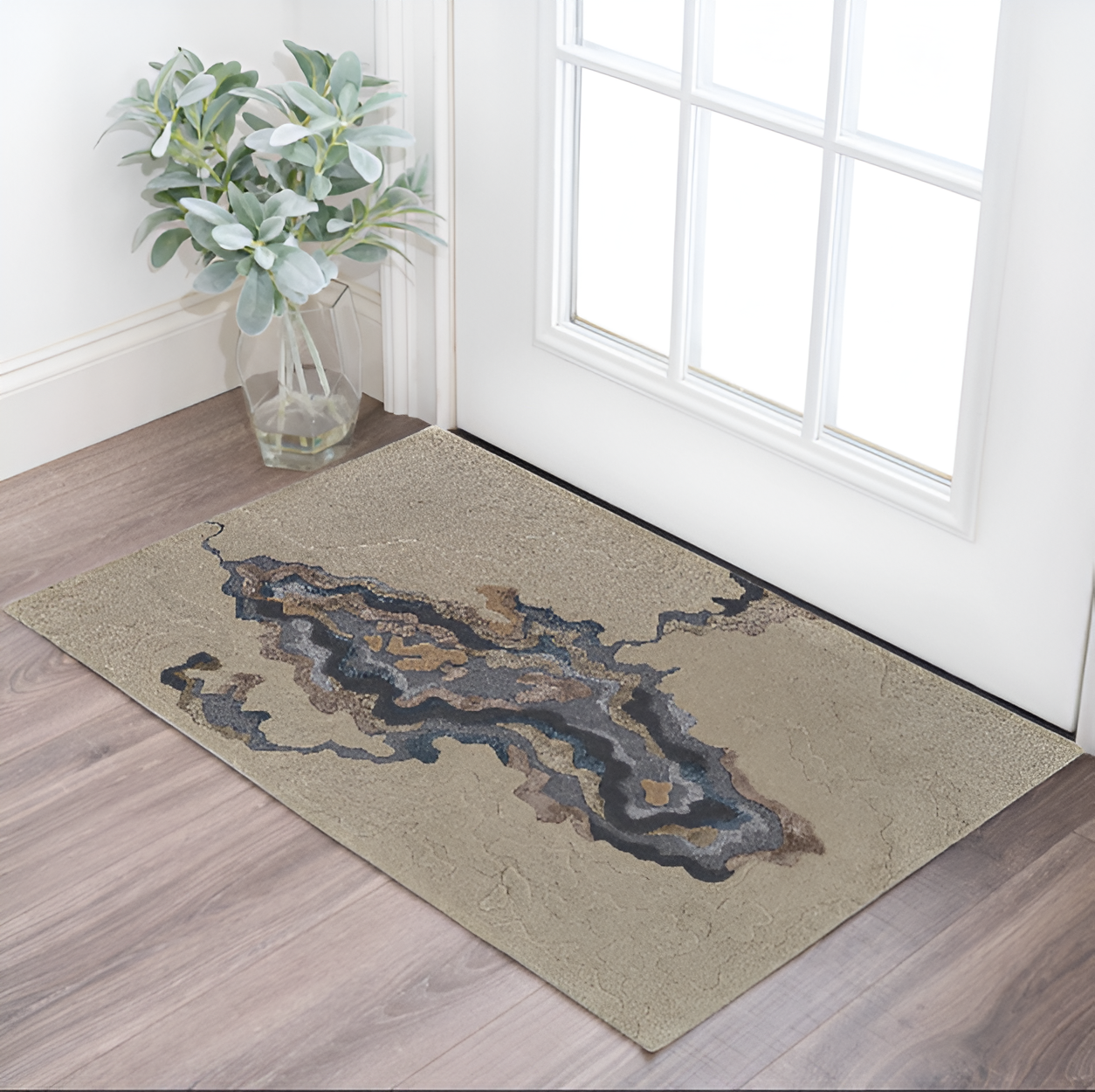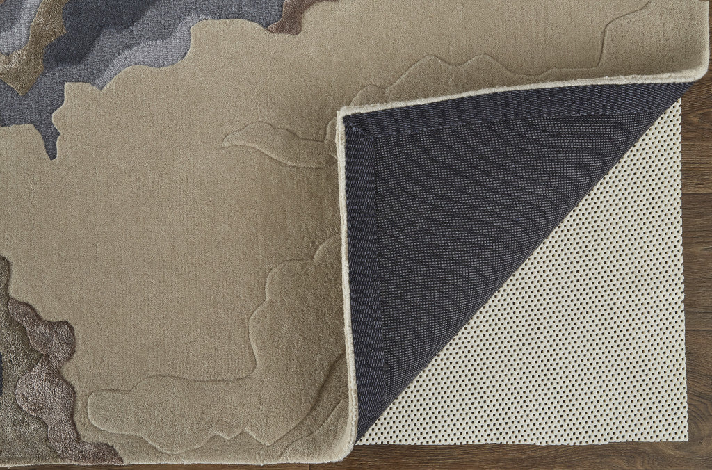 - Handmade wool area rug in tan and brown hue for a high-low effect.