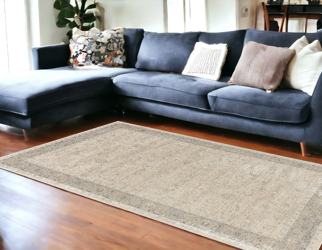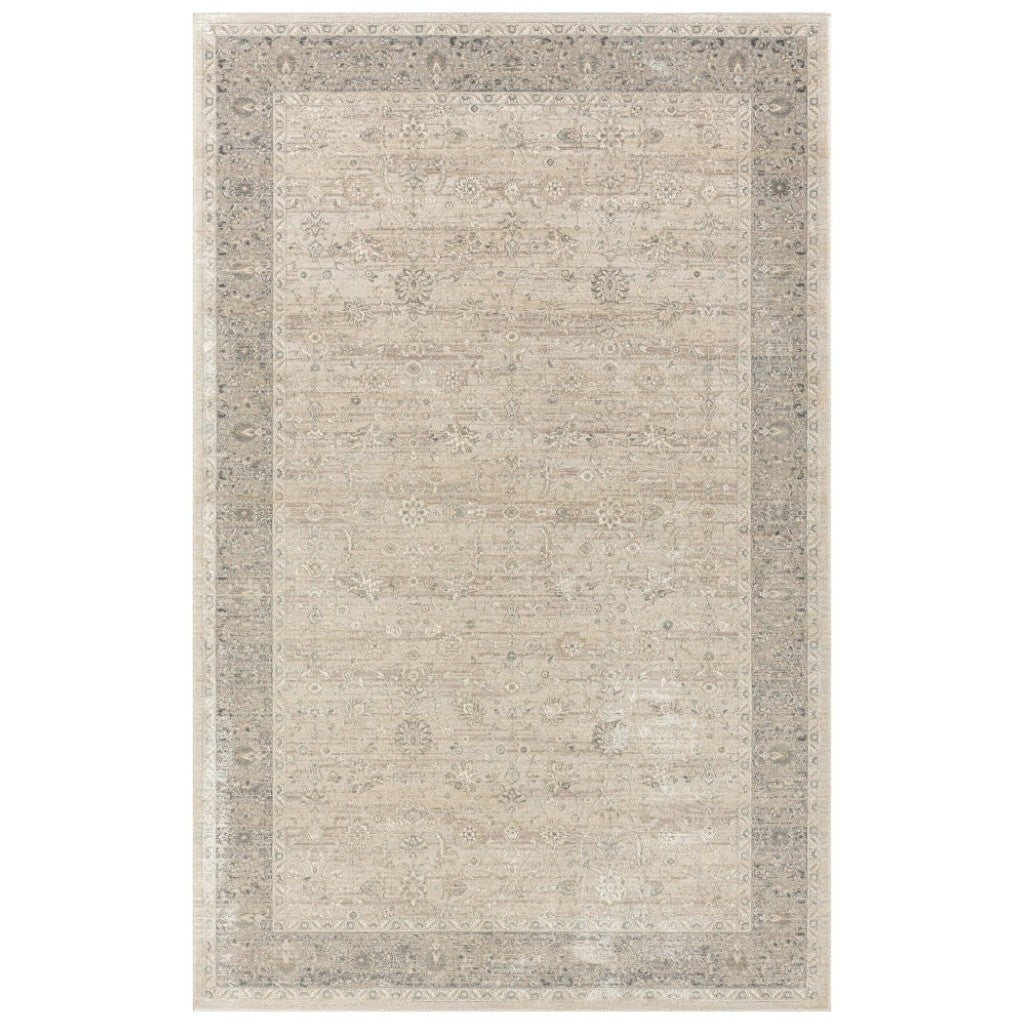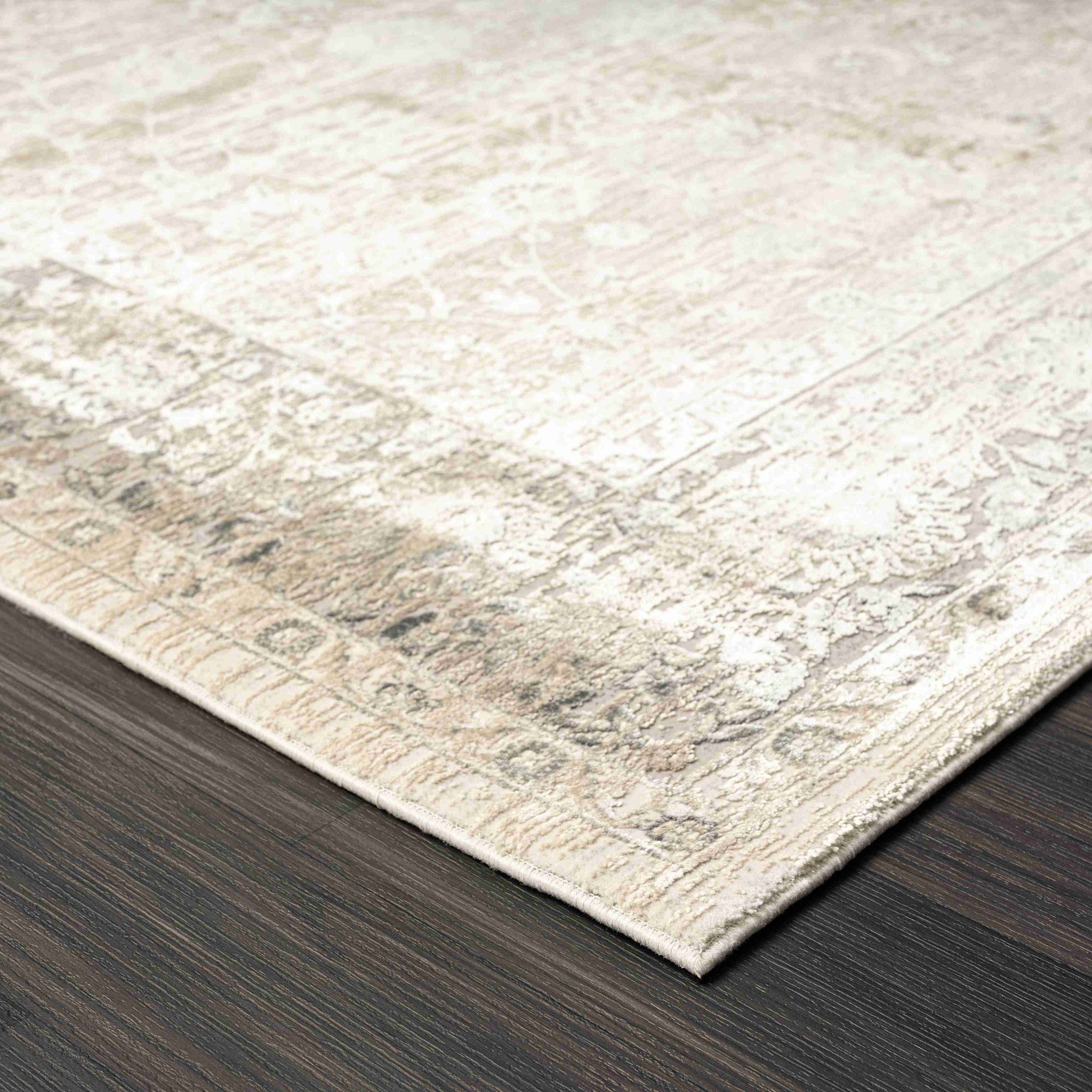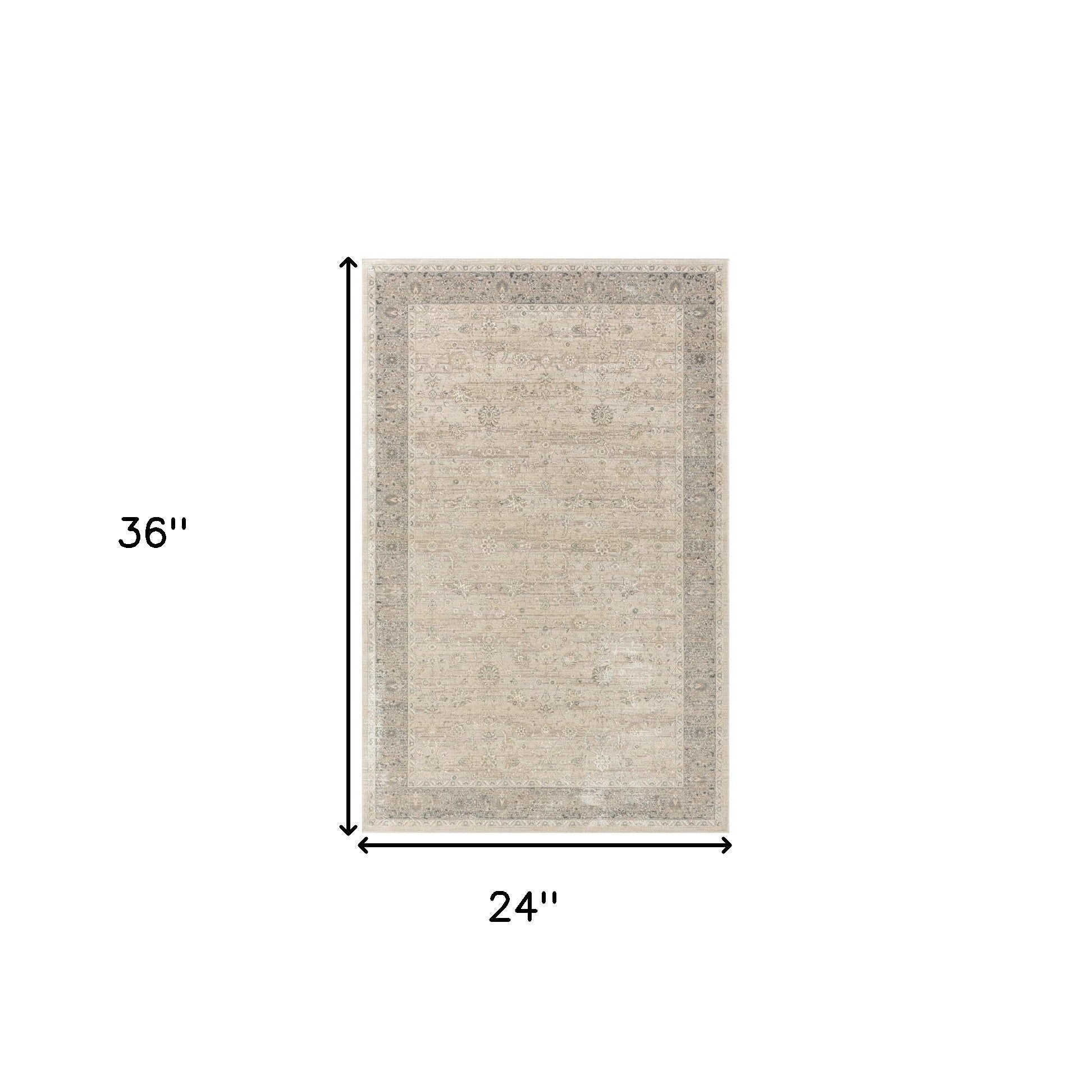 - Machine-made viscose area rug in beige and ivory traditional style.
