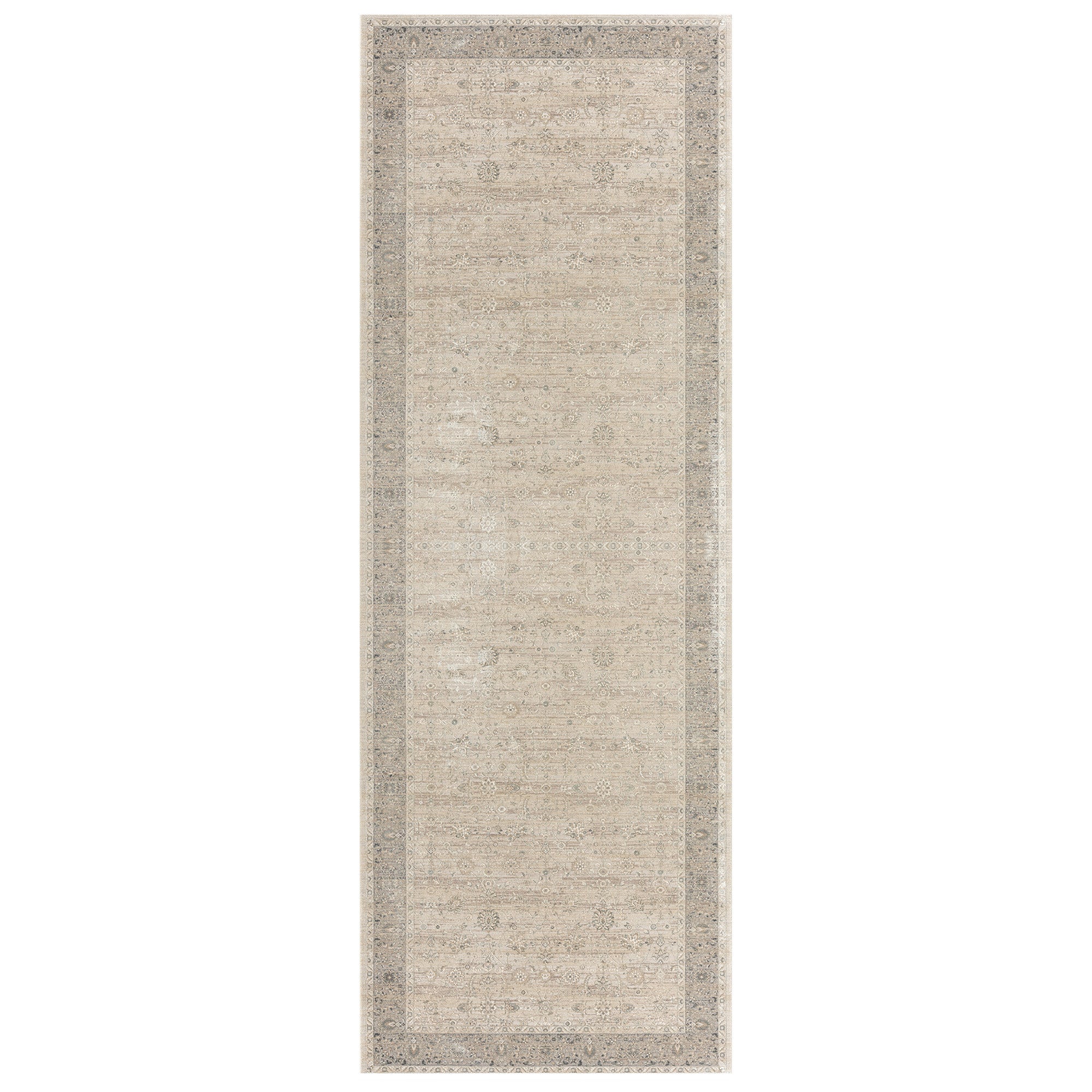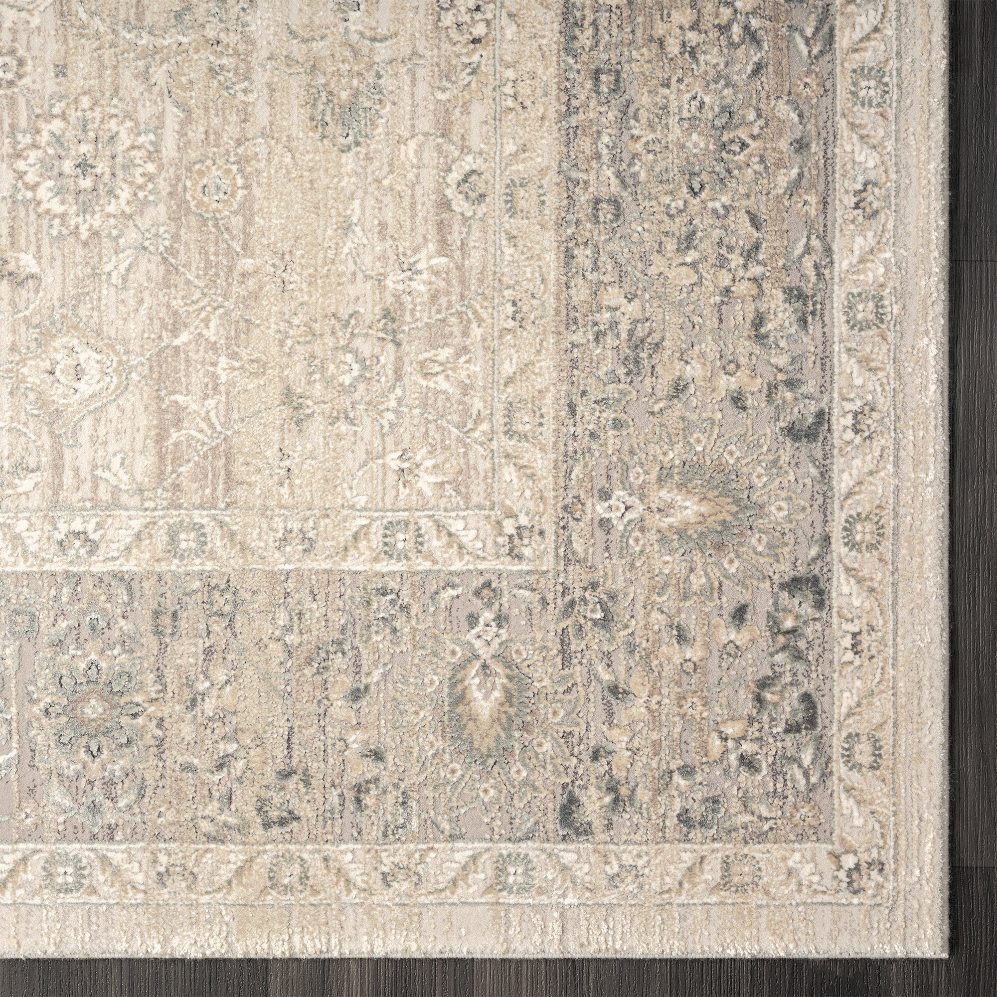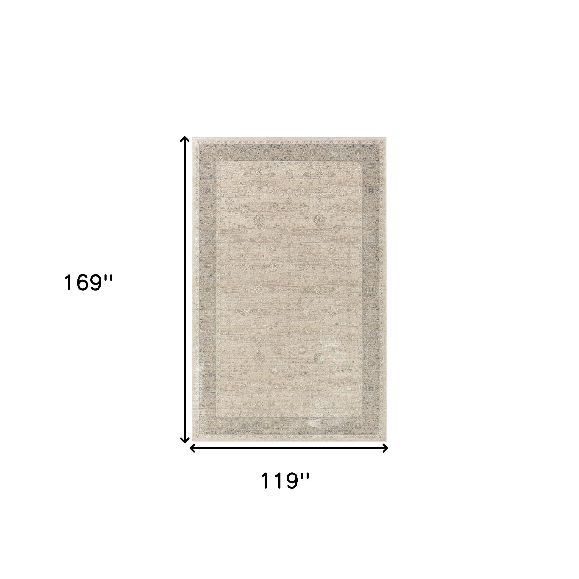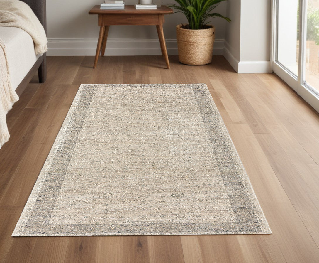 - Machine-made viscose area rug in beige and ivory traditional style.
