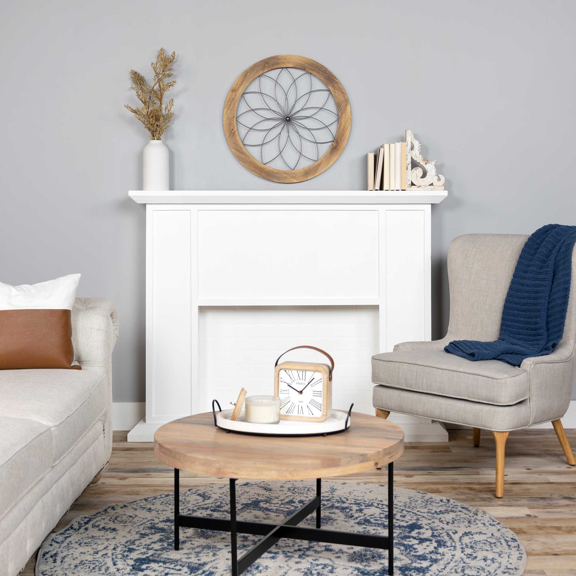 - Measuring 25.75 W x 1.75 D x 25.75 H inches, this round wall decor is fitted with a sawtooth attachment for an easy and stable mounting.