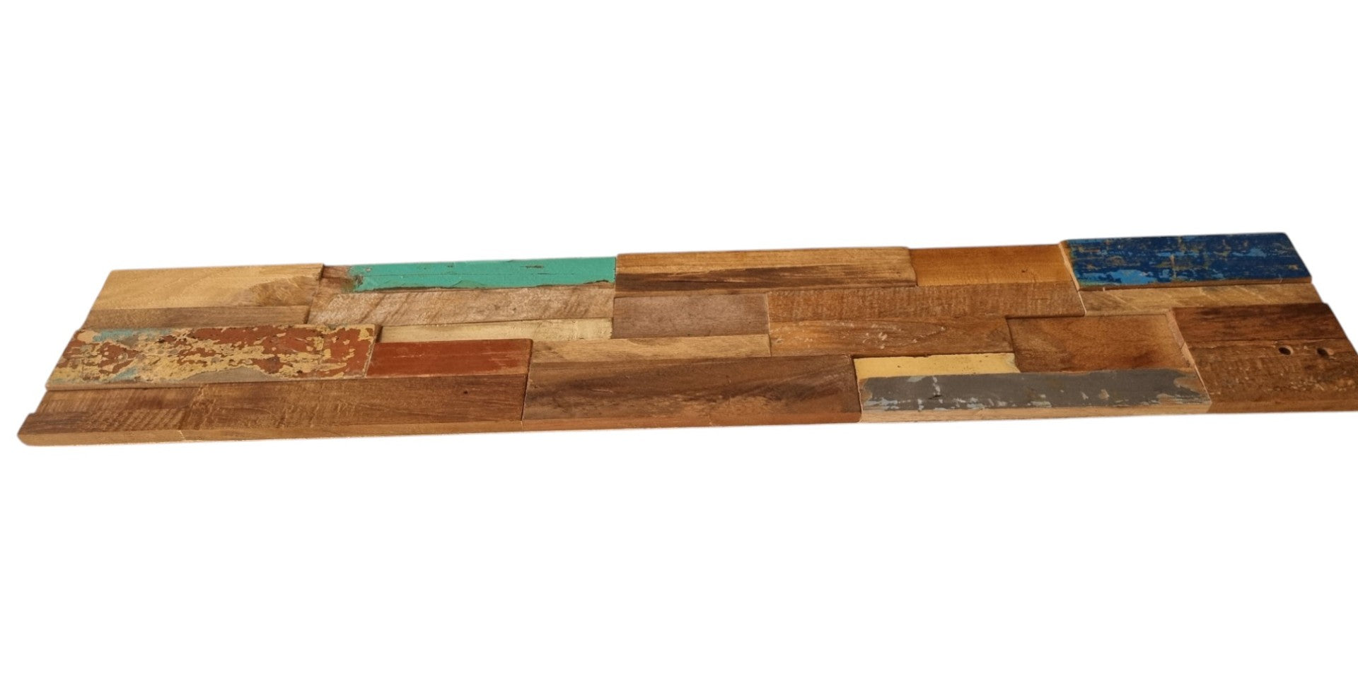 - Hand-crafted by skilled artisans from reclaimed teak wood adhered to manufactured wood substrates to create the panels.
