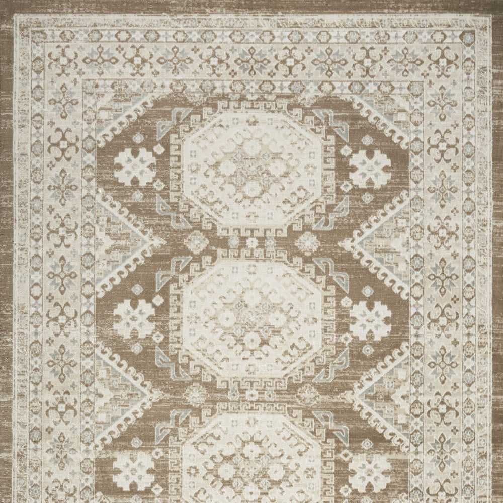 - High-Low machine-made area rug with a rustic brown synthetic material.