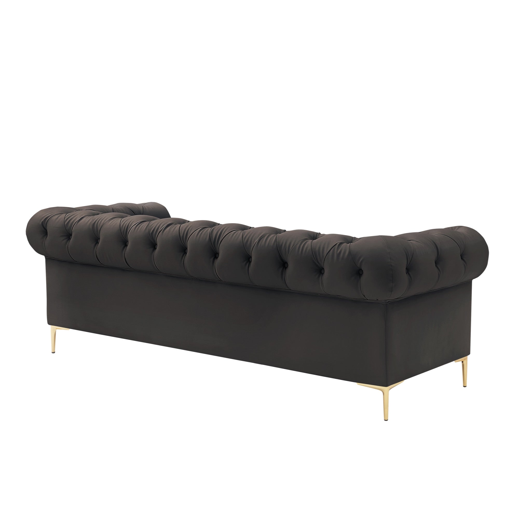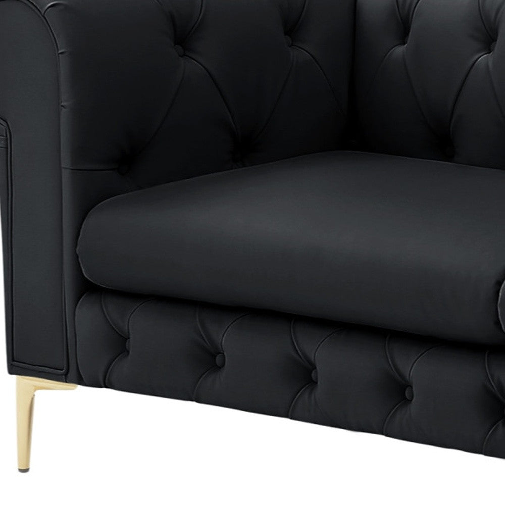 - Elegant black sofa with gold legs and sinuous springs for comfortable seating.