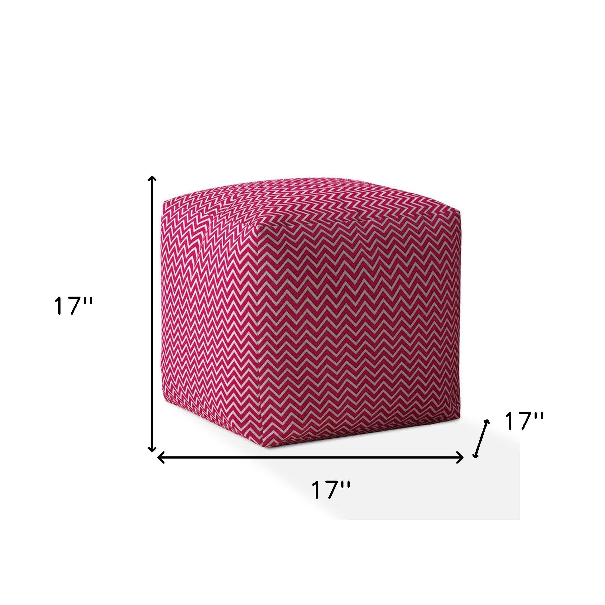 - Upholstered ottoman in pink and white chevron pattern.