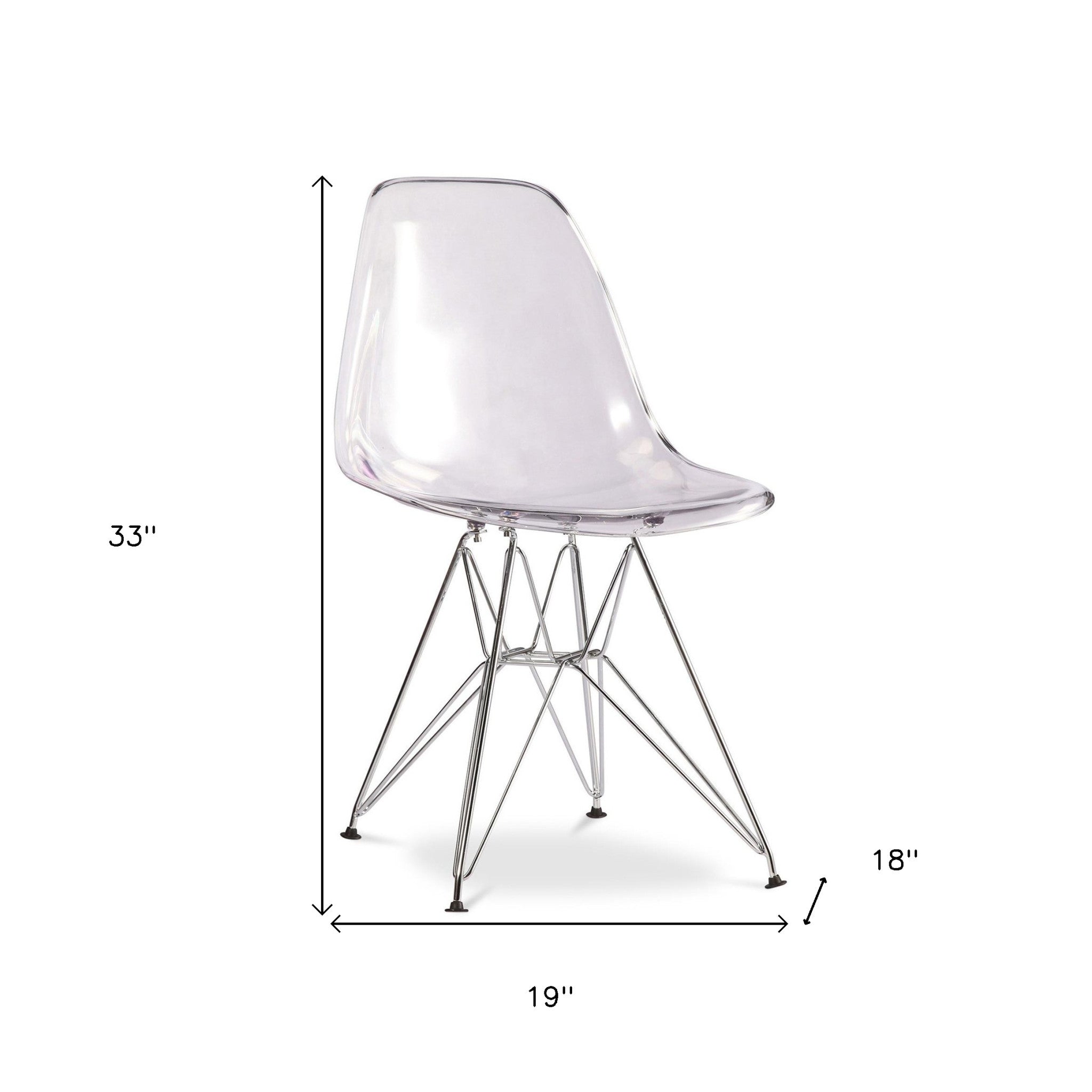 - Clear acrylic contoured seat dining chair with geometric chrome base legs.