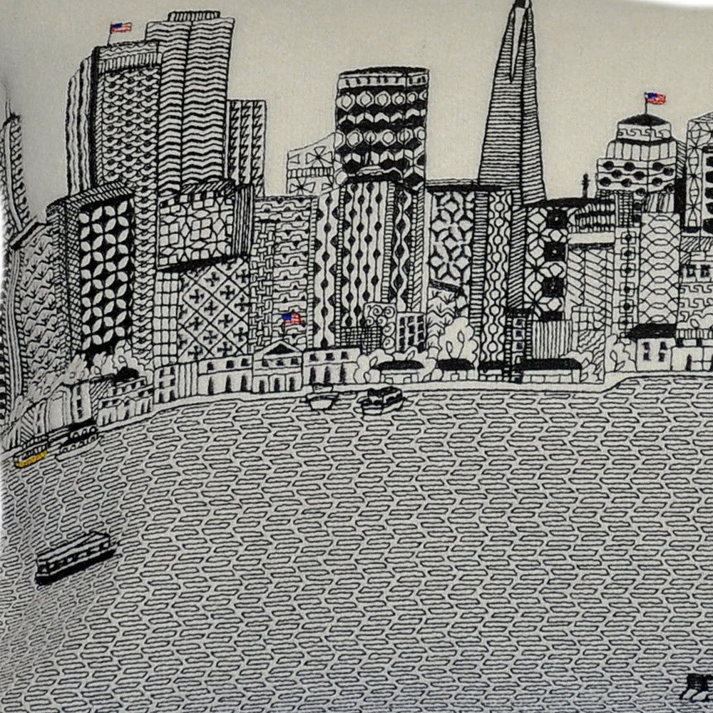 - Features an eclectic San Francisco cityscape / skyline on front, with solid color on the back.