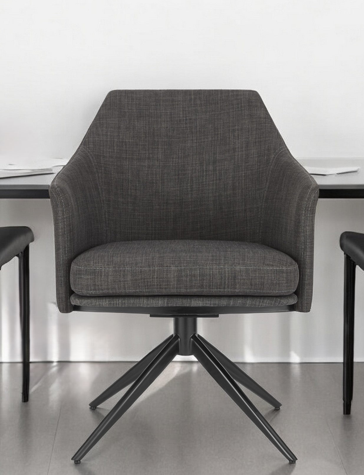 - Contemporary dark gray arm chair with metal legs.