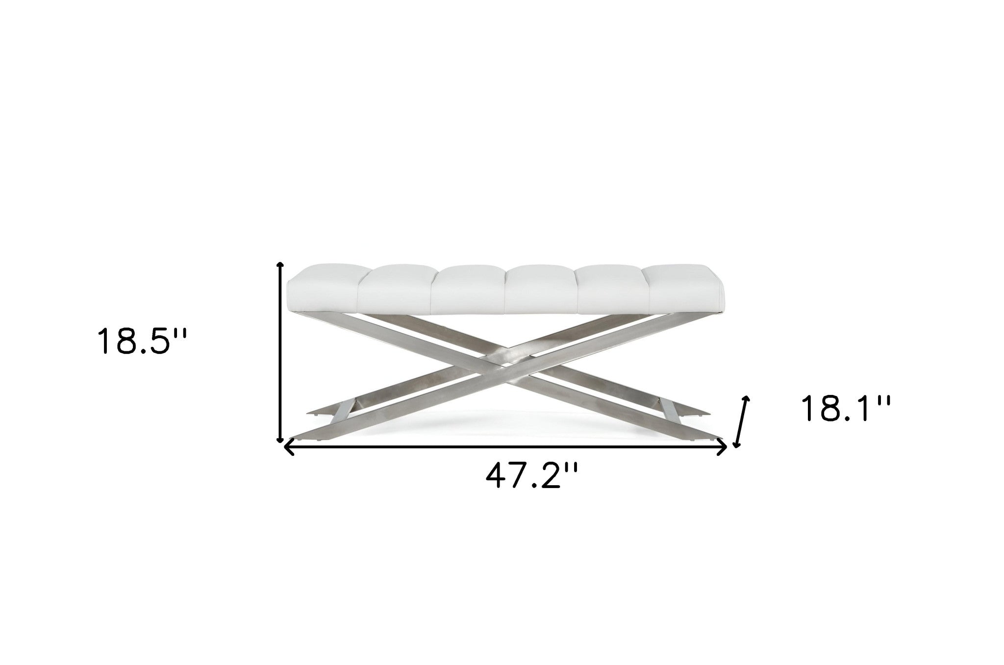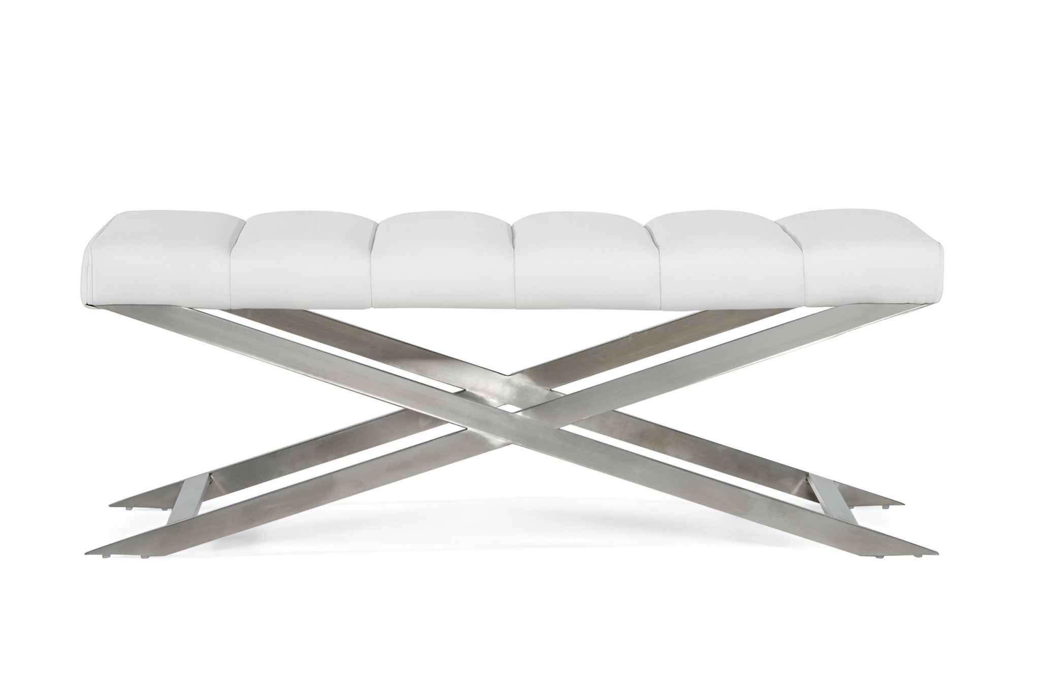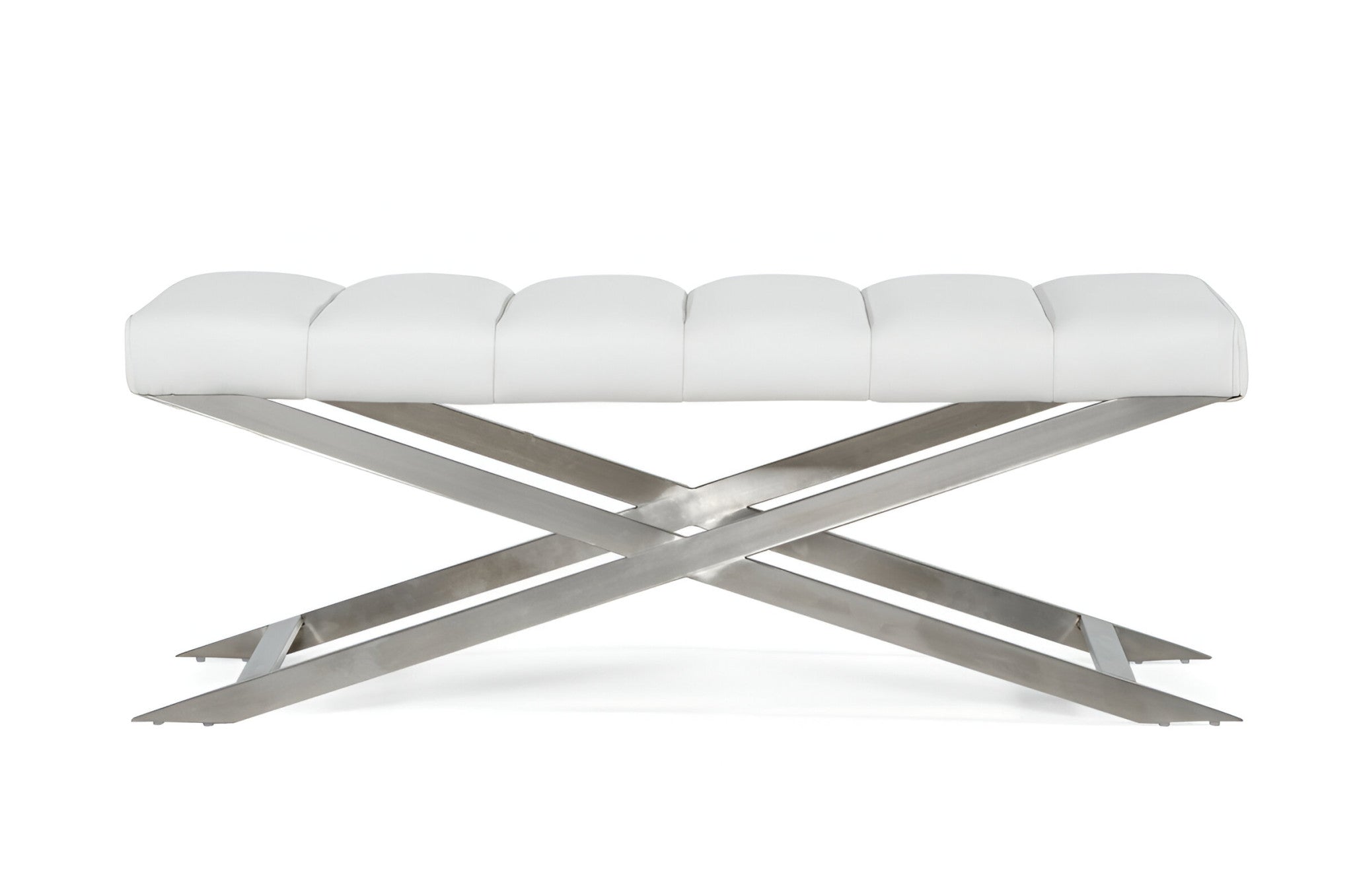 - Modern white bench with faux leather upholstery.