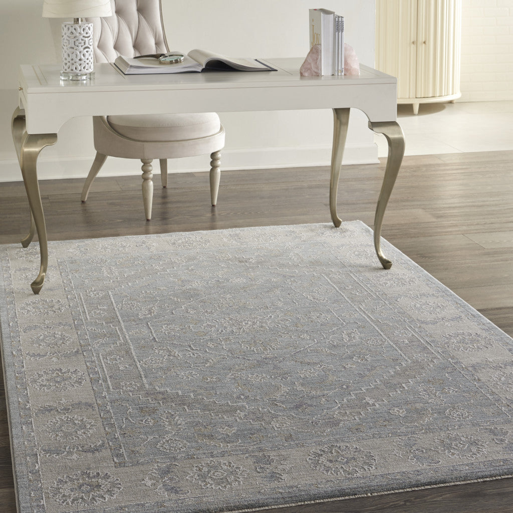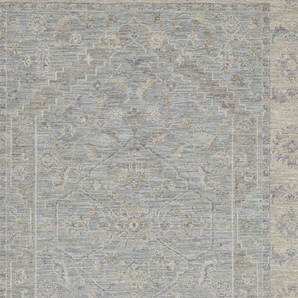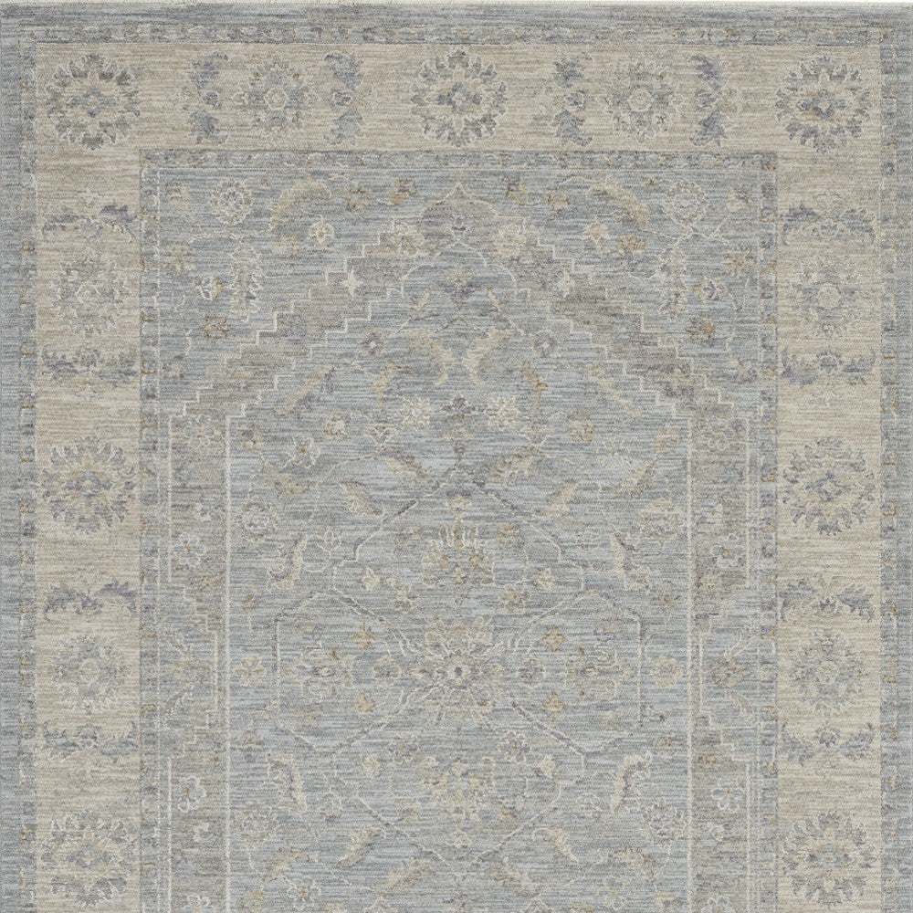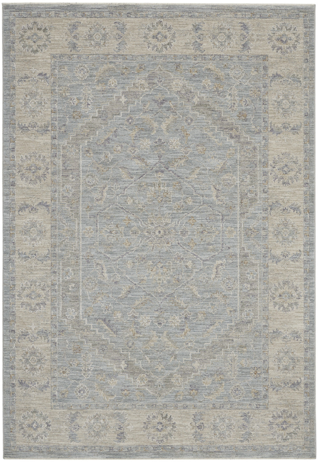 - Machine-made area rug in a classic beige and blue traditional style. Easy to maintain with vacuuming.