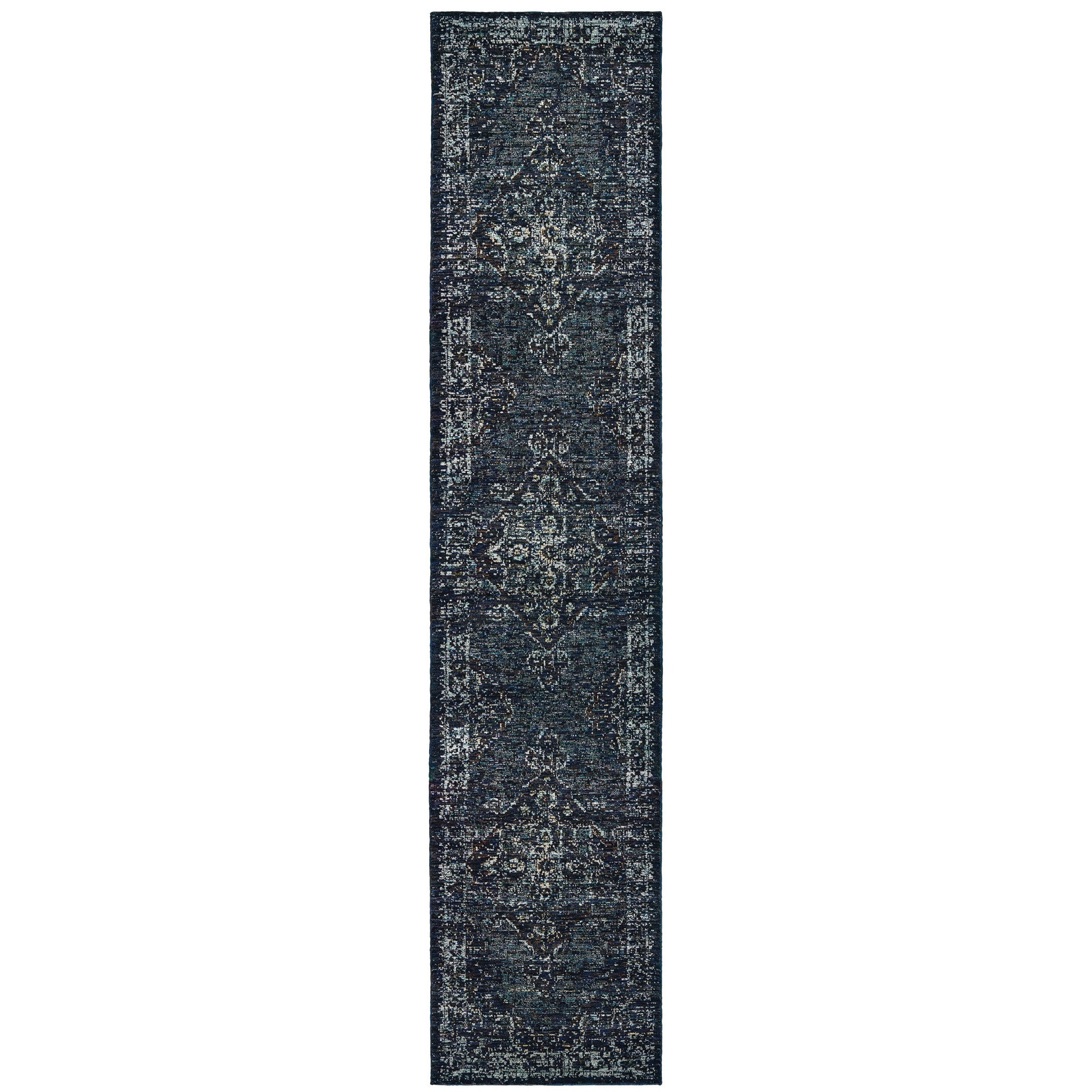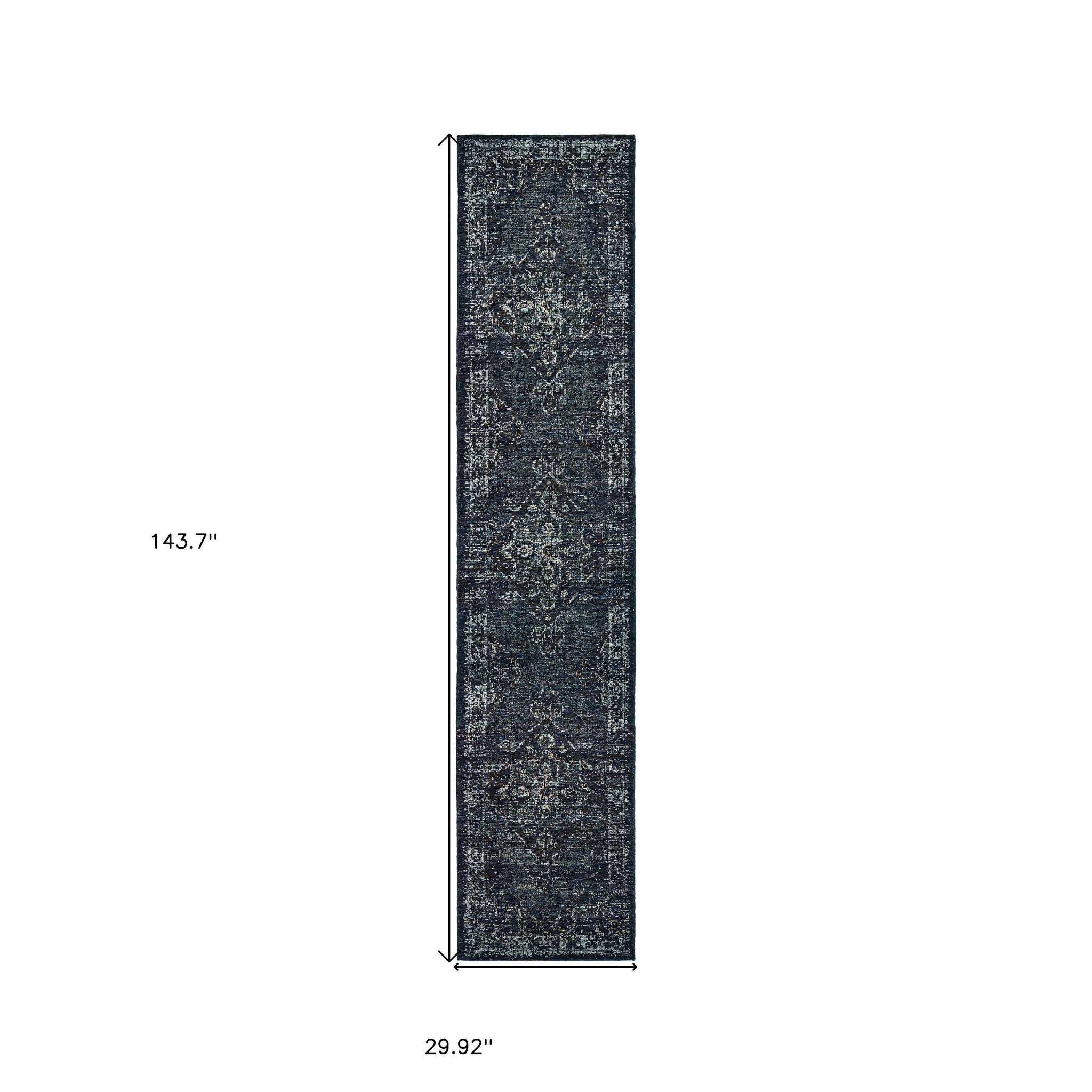 - Machine made blue and ivory area rug in unique material.
