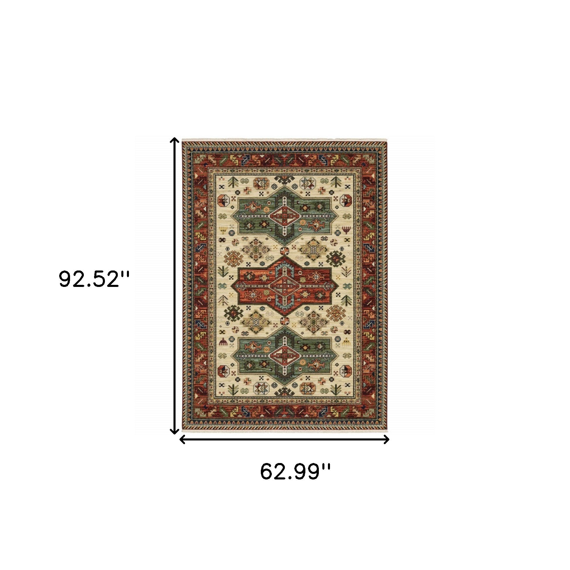 - Rug features shades of red, gold, blue, brown, green and ivory