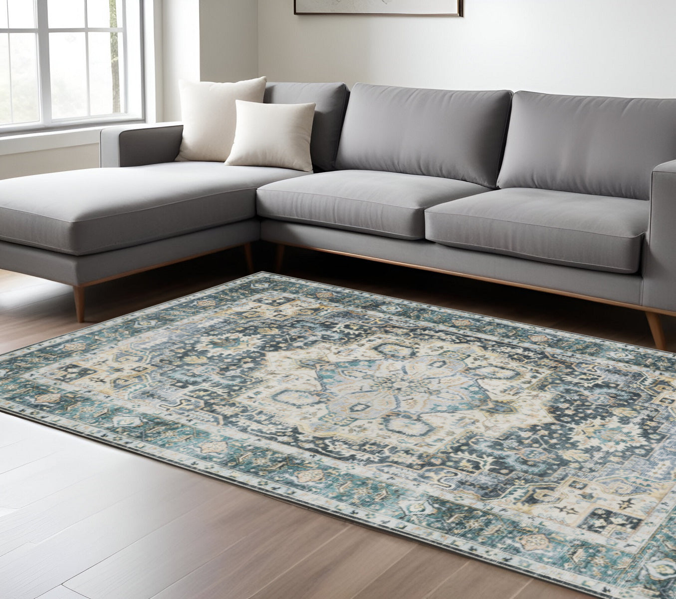 - Features shades of blue on an ivory background with pops of teal, brown and gold