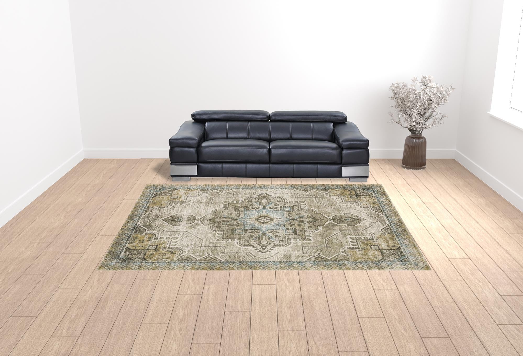 - Rug colors include shades of grey, blue, beige and gold