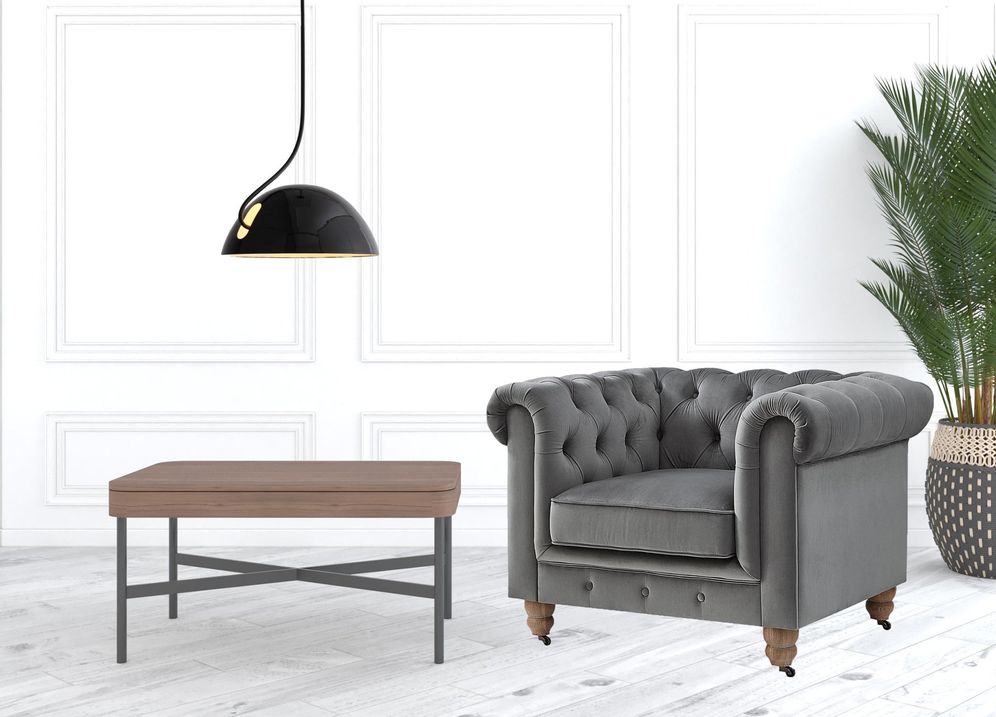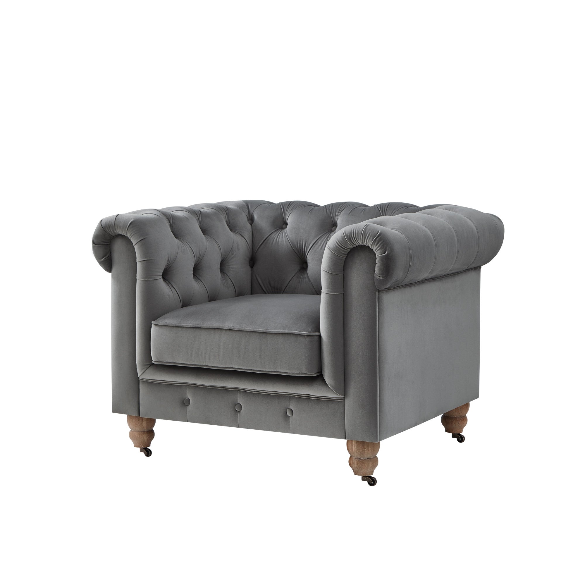- Chesterfield design accent chair with a dark gray velvet upholstery.