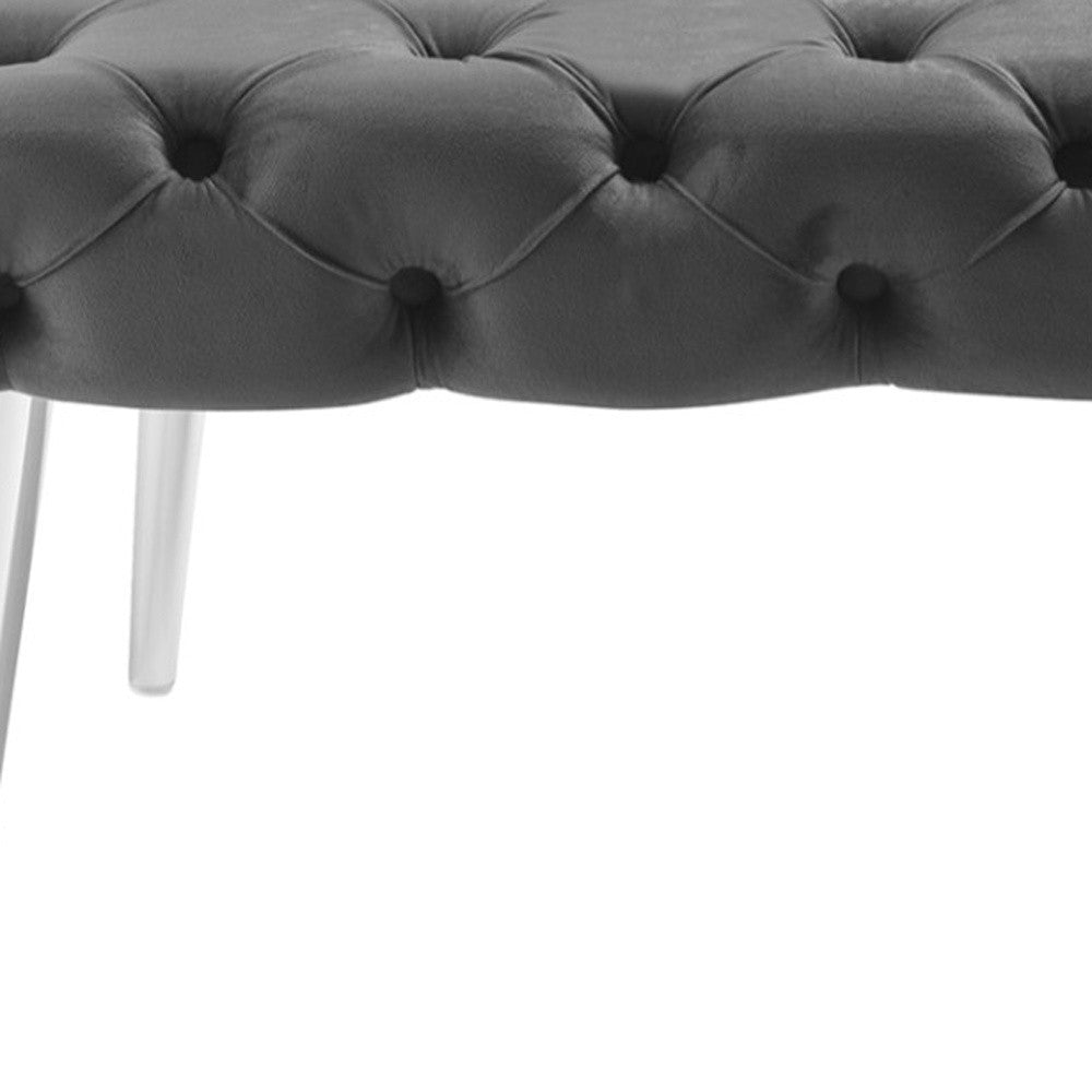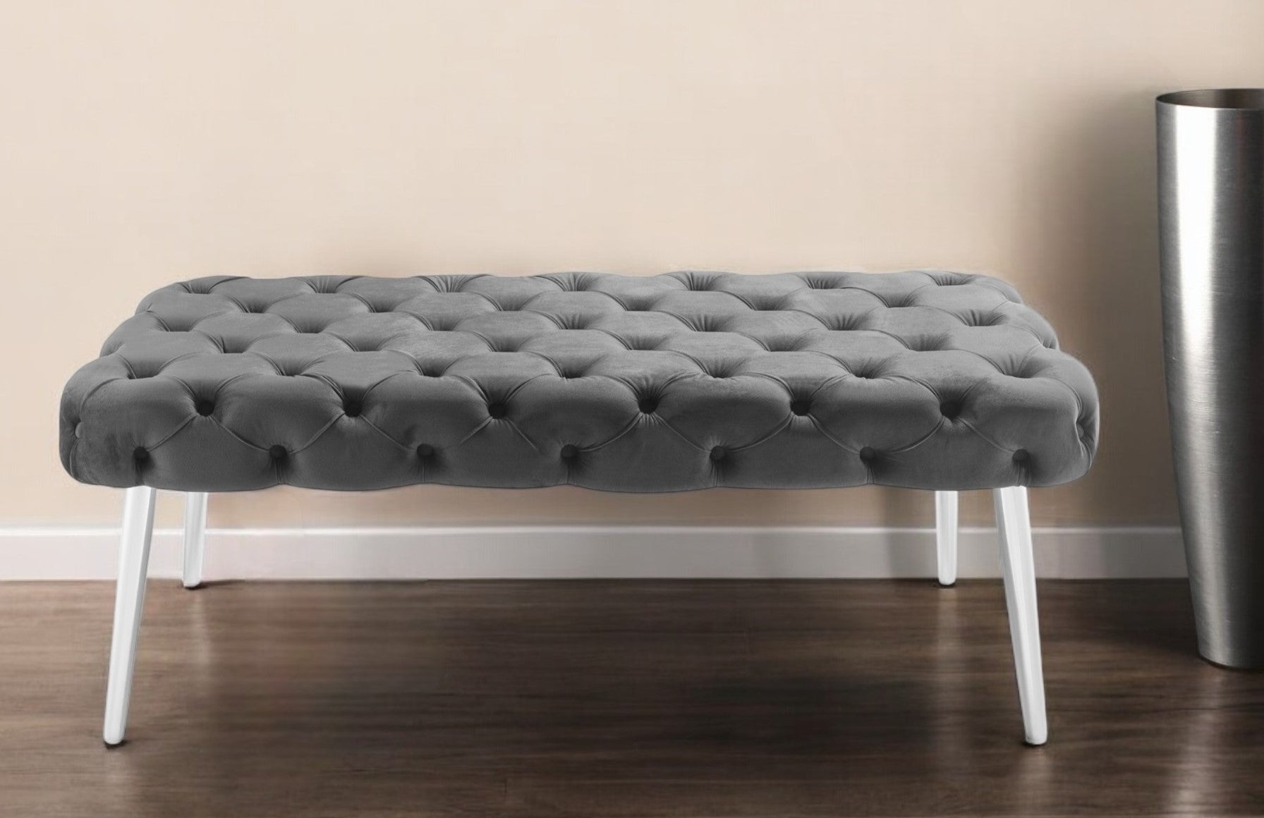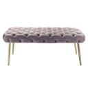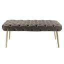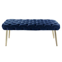 - Navy Blue velvet upholstered bench with gold metal legs.