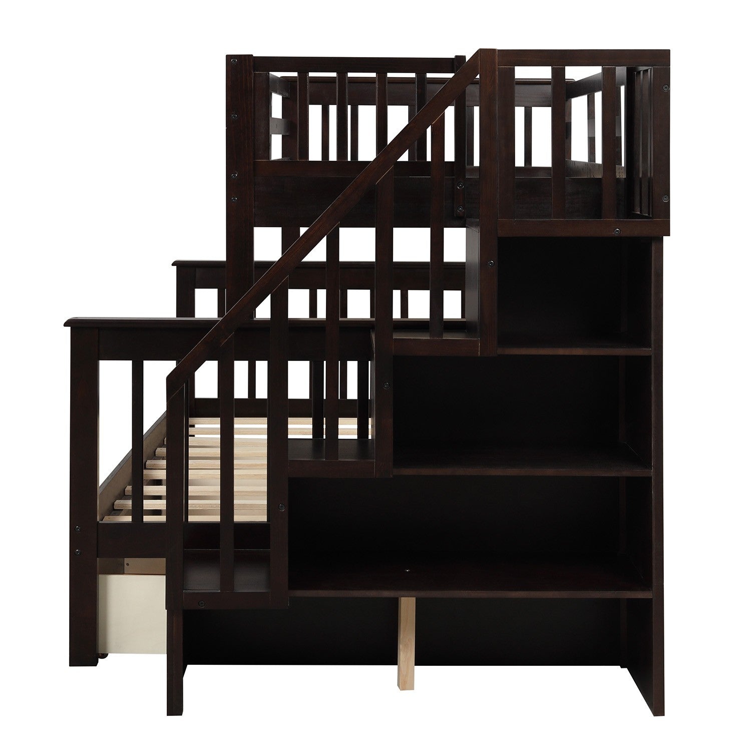 - Maximized storage space: Four compartments of different sizes hide underneath the stairs of this bunk bed and are perfect for you to store quilts, bed sheets and other necessities. On top of that, you can store books and toys