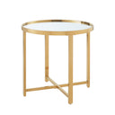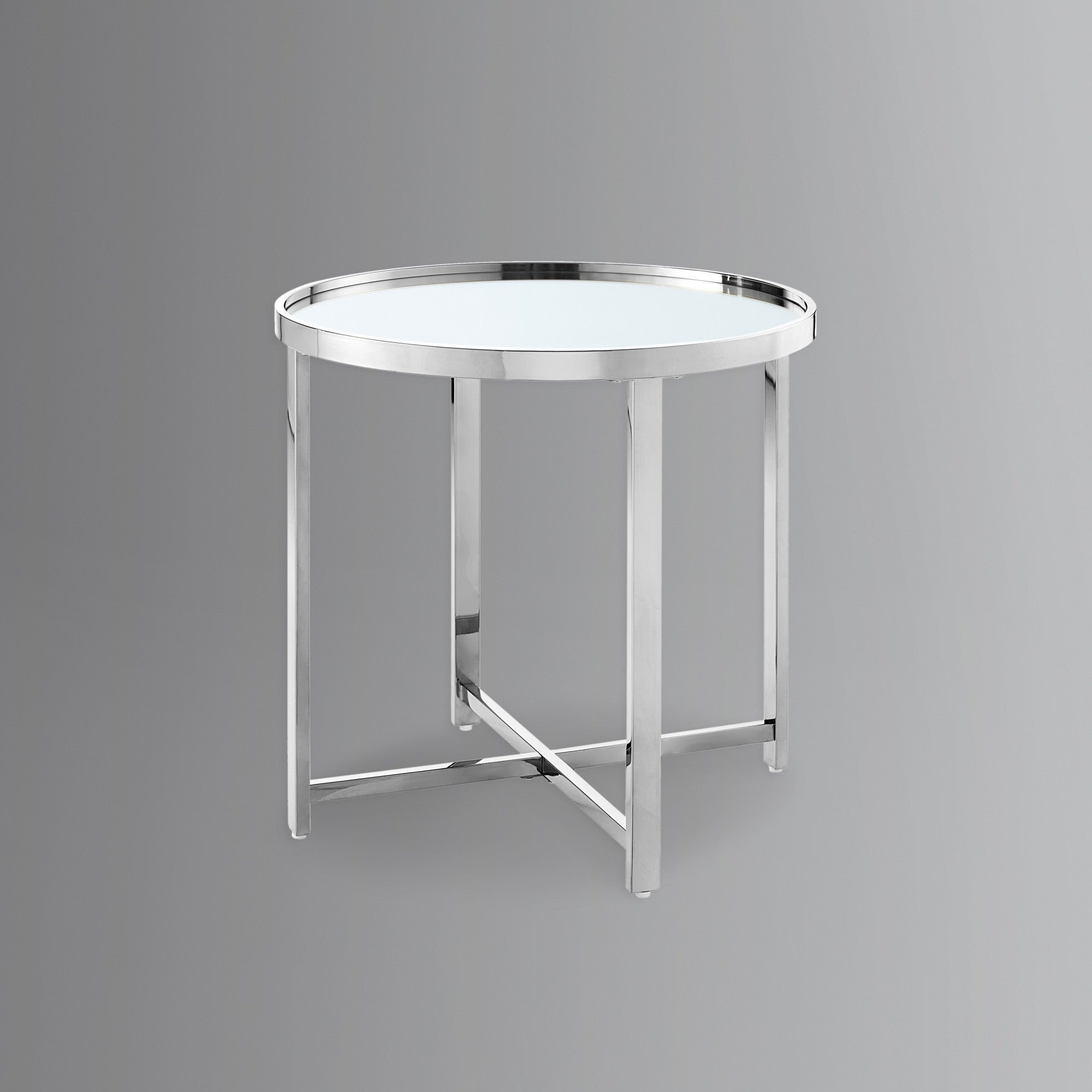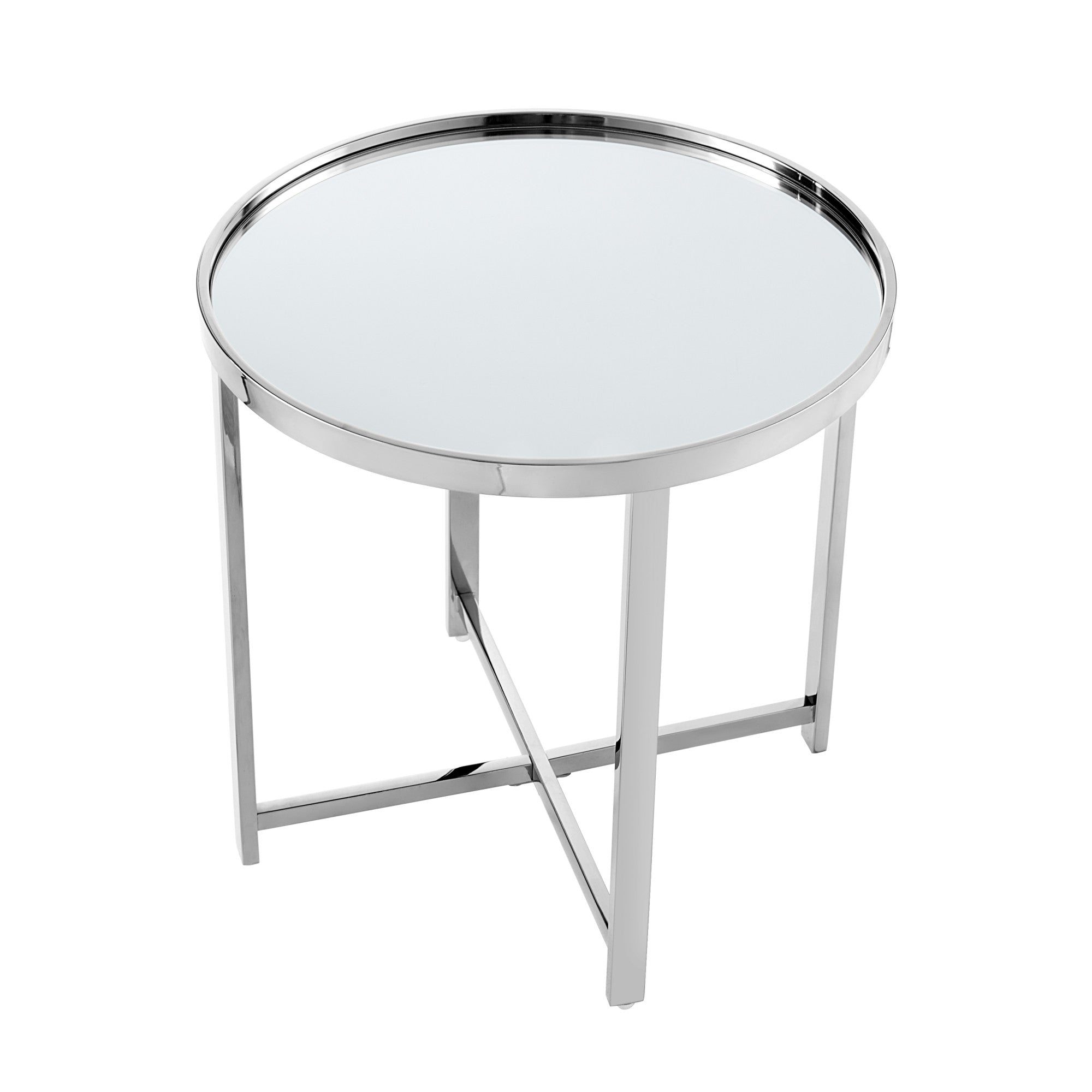 - Features a stainless steel silver chrome finish frame and a mirrored glass round tabletop surface.
