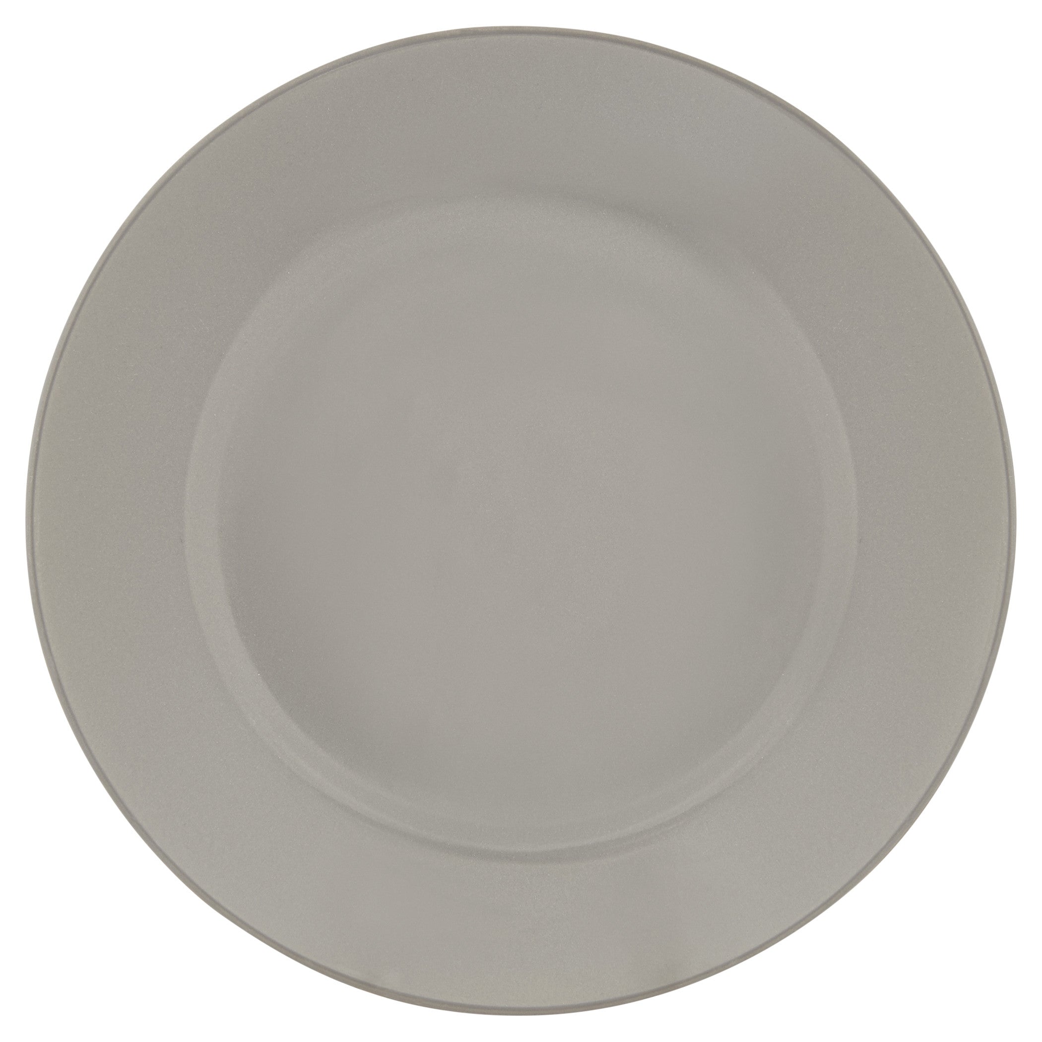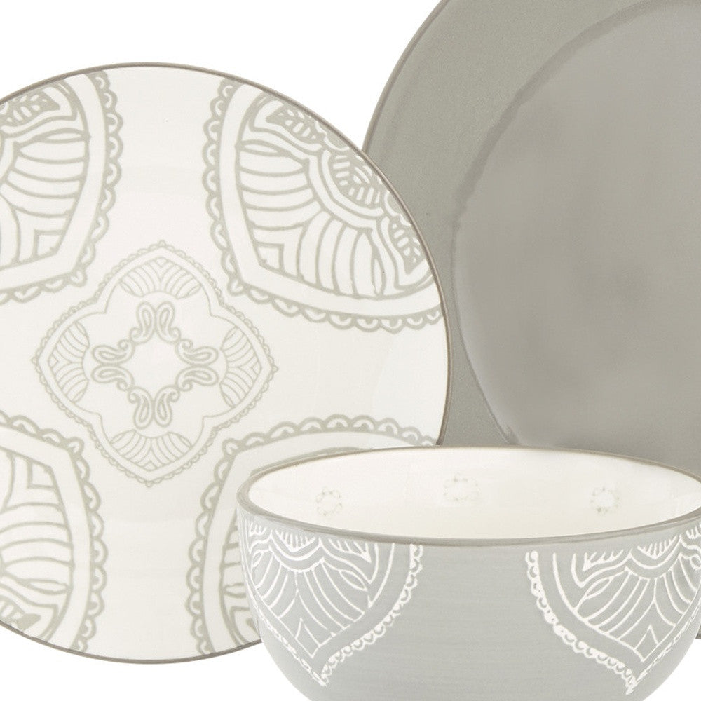 - Modern Gray / Taupe / Ivory dinnerware set with a mix of solid color and modern geometric shape patterning.