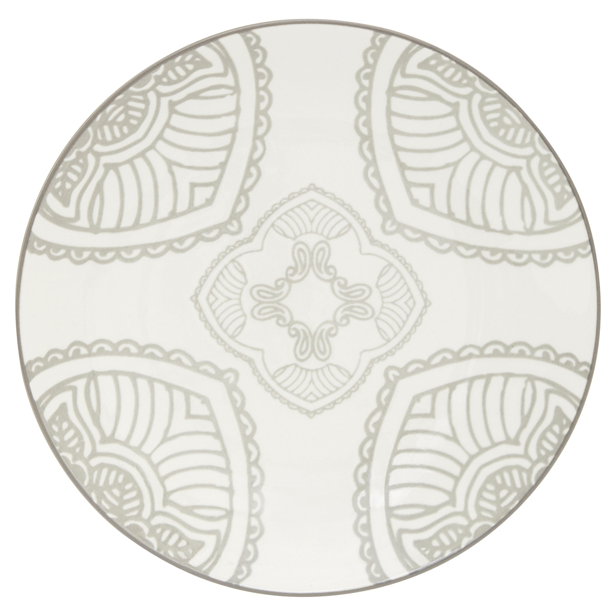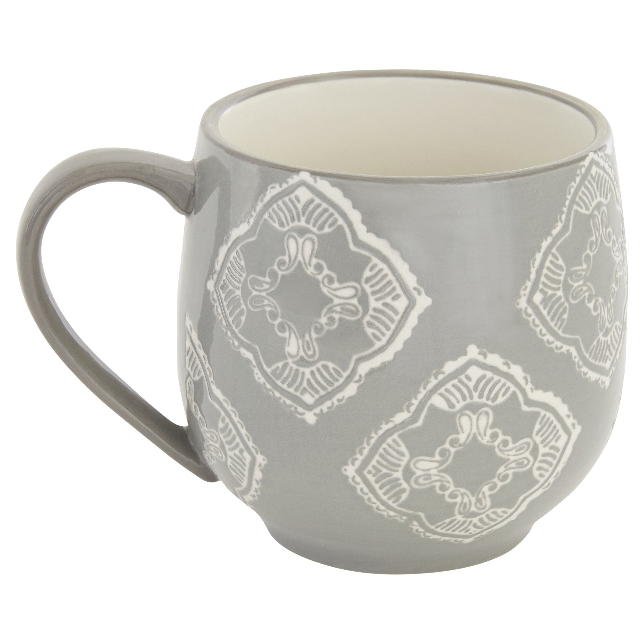 - The mug and cereal bowl feature a gray / taupe base with ivory decoration and the salad plate features the inverse.