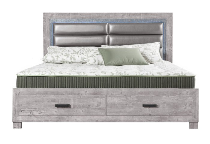 - Distressed Gray King Size Storage bed with LED and faux crystal bling headboard.