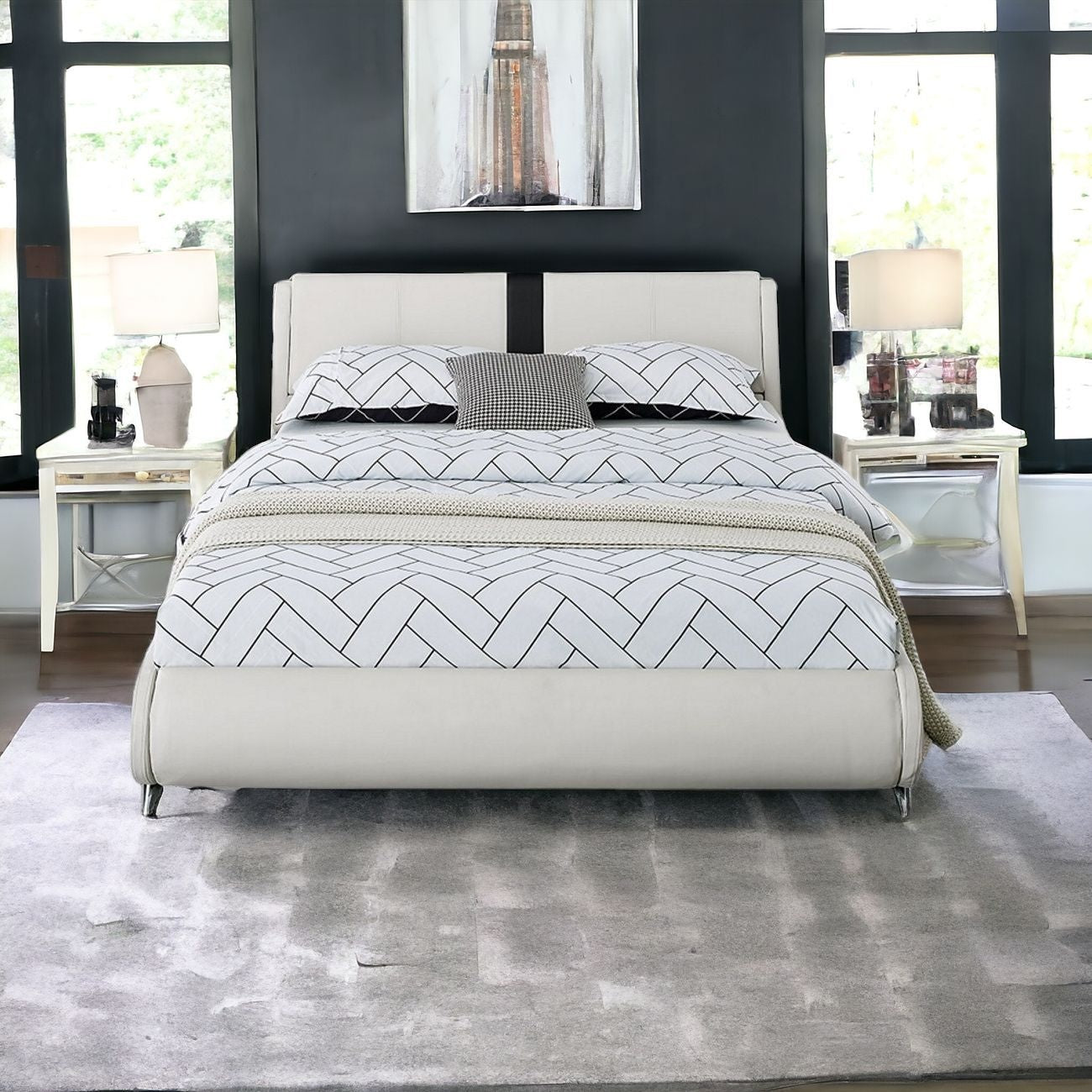 - Solid and manufactured wood construction with white faux leather upholstery.