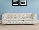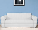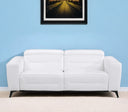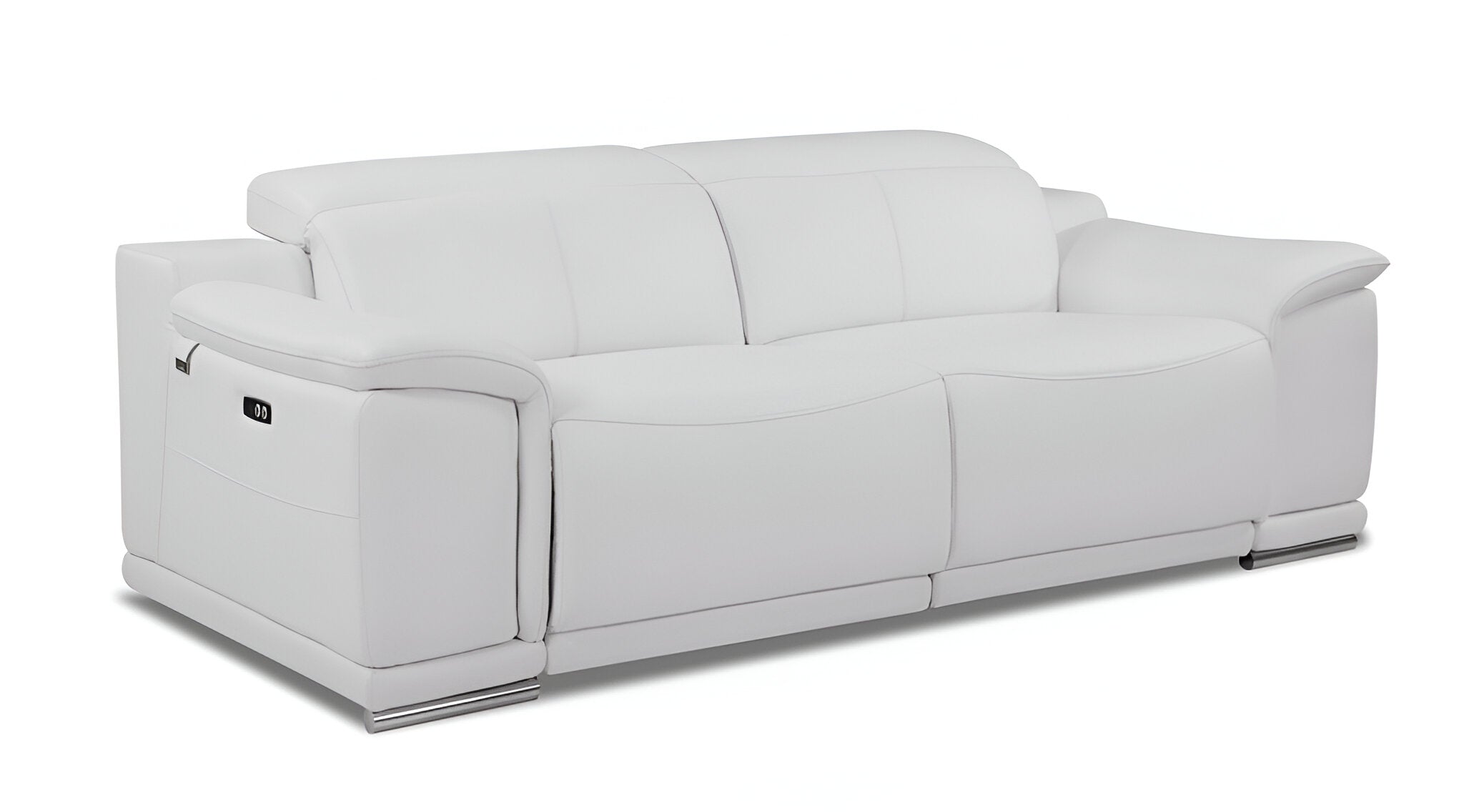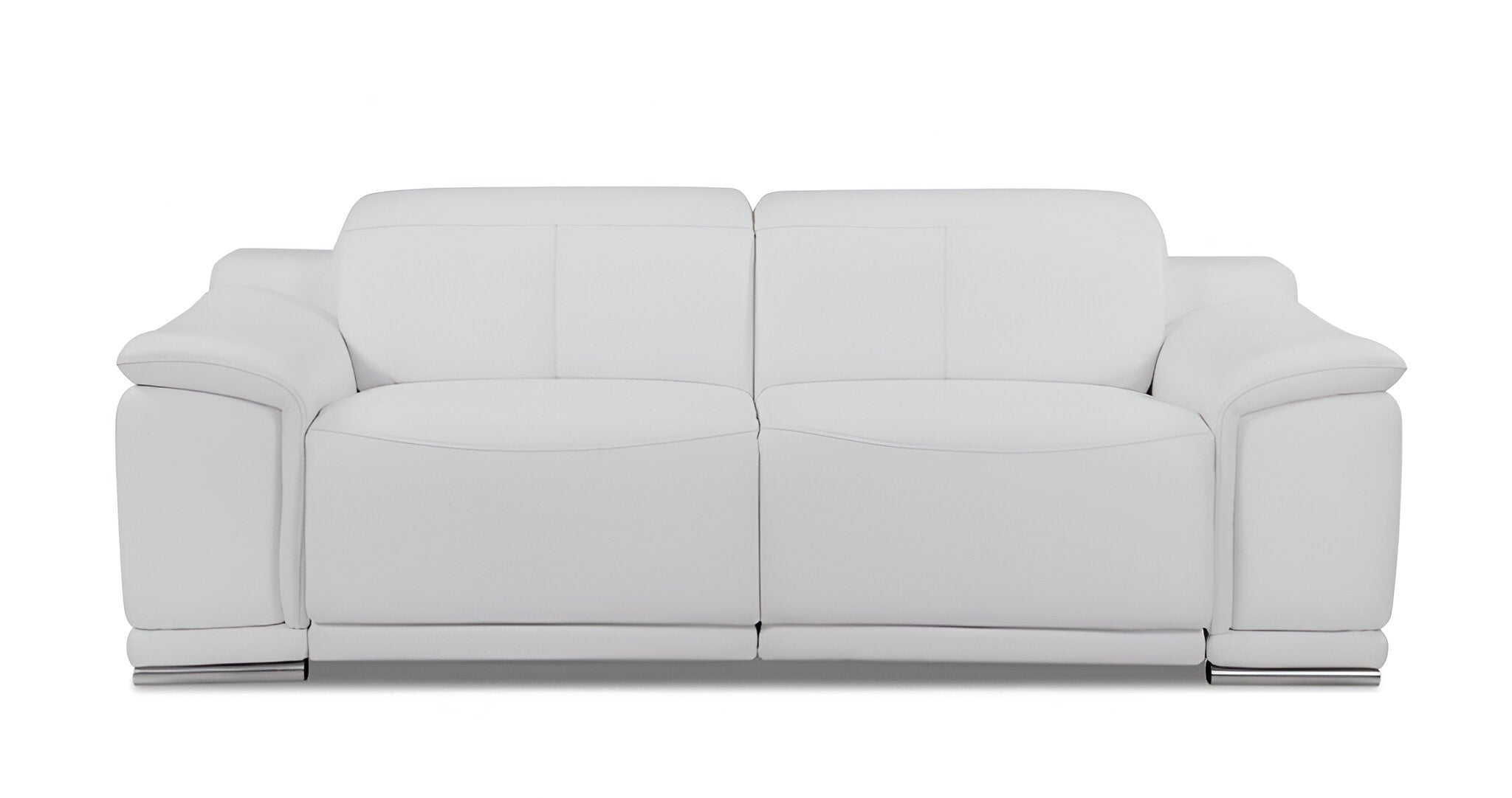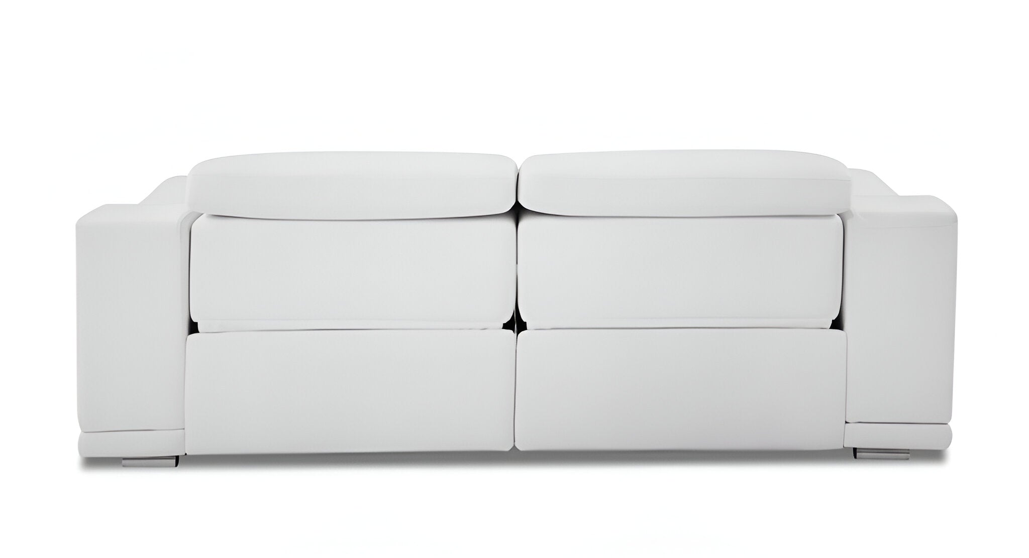 - Power reclining sofa in stylish white upholstery and sleek black stainless steel legs.
