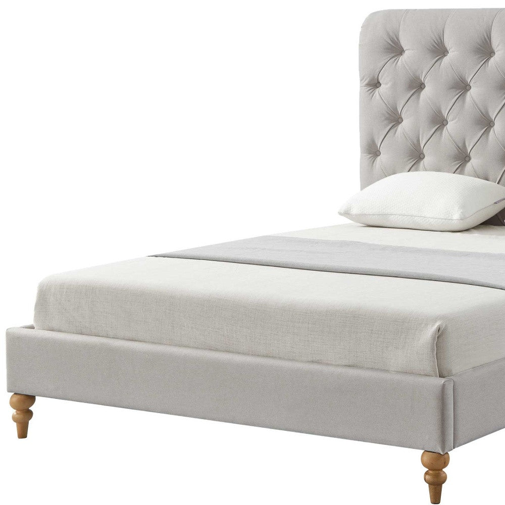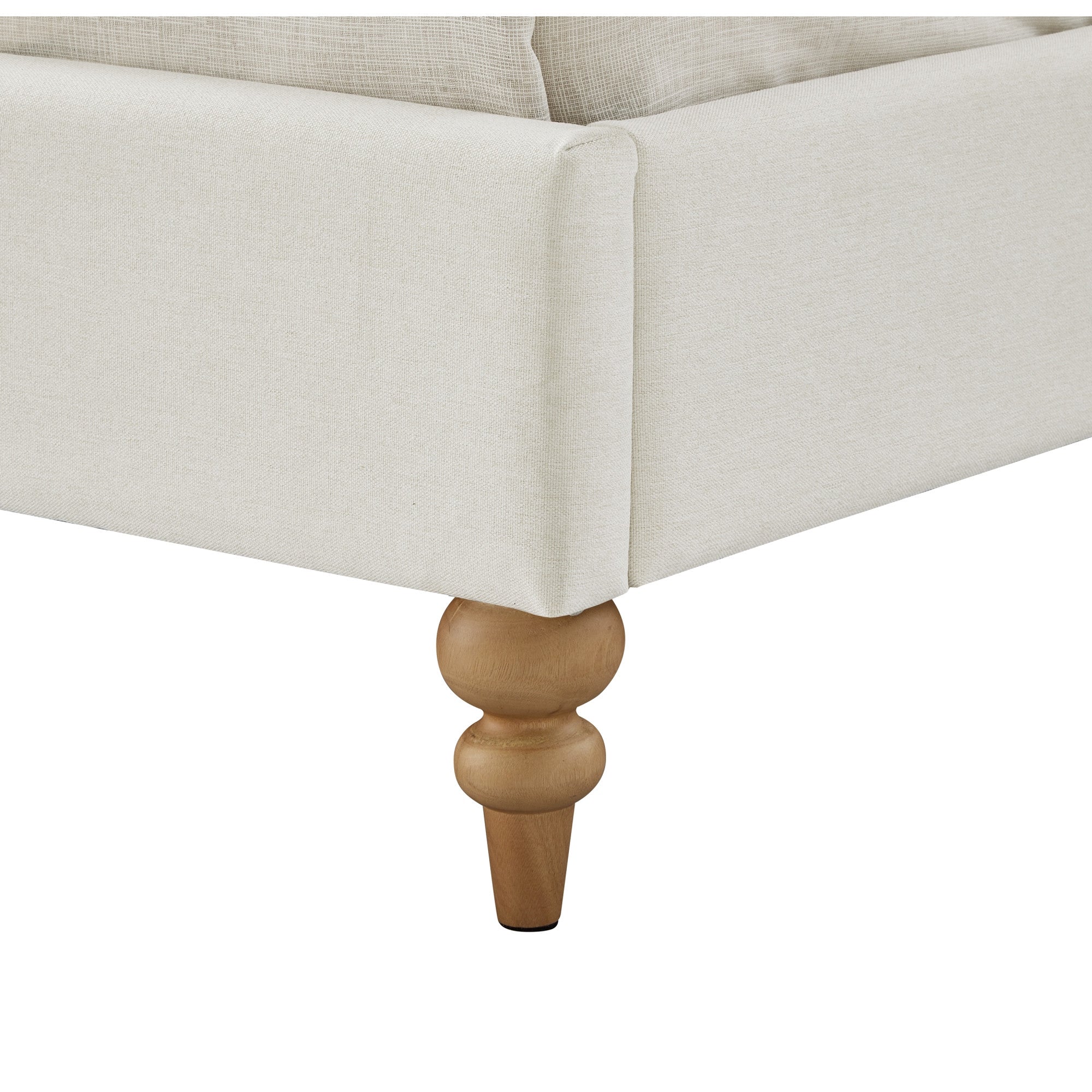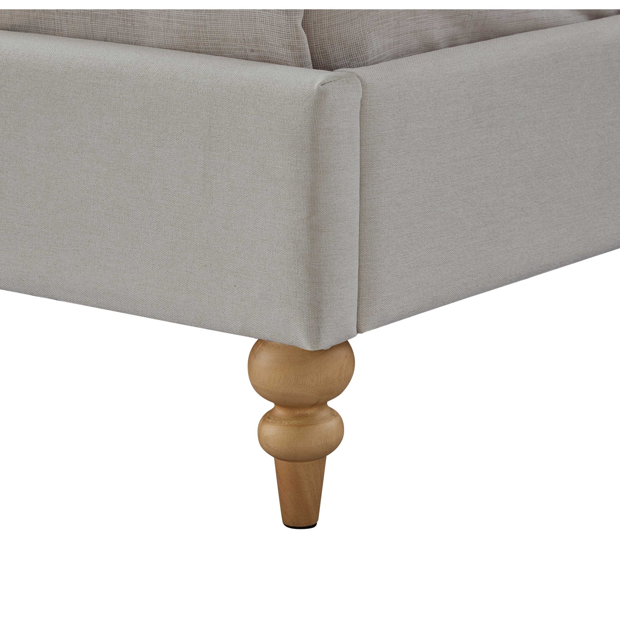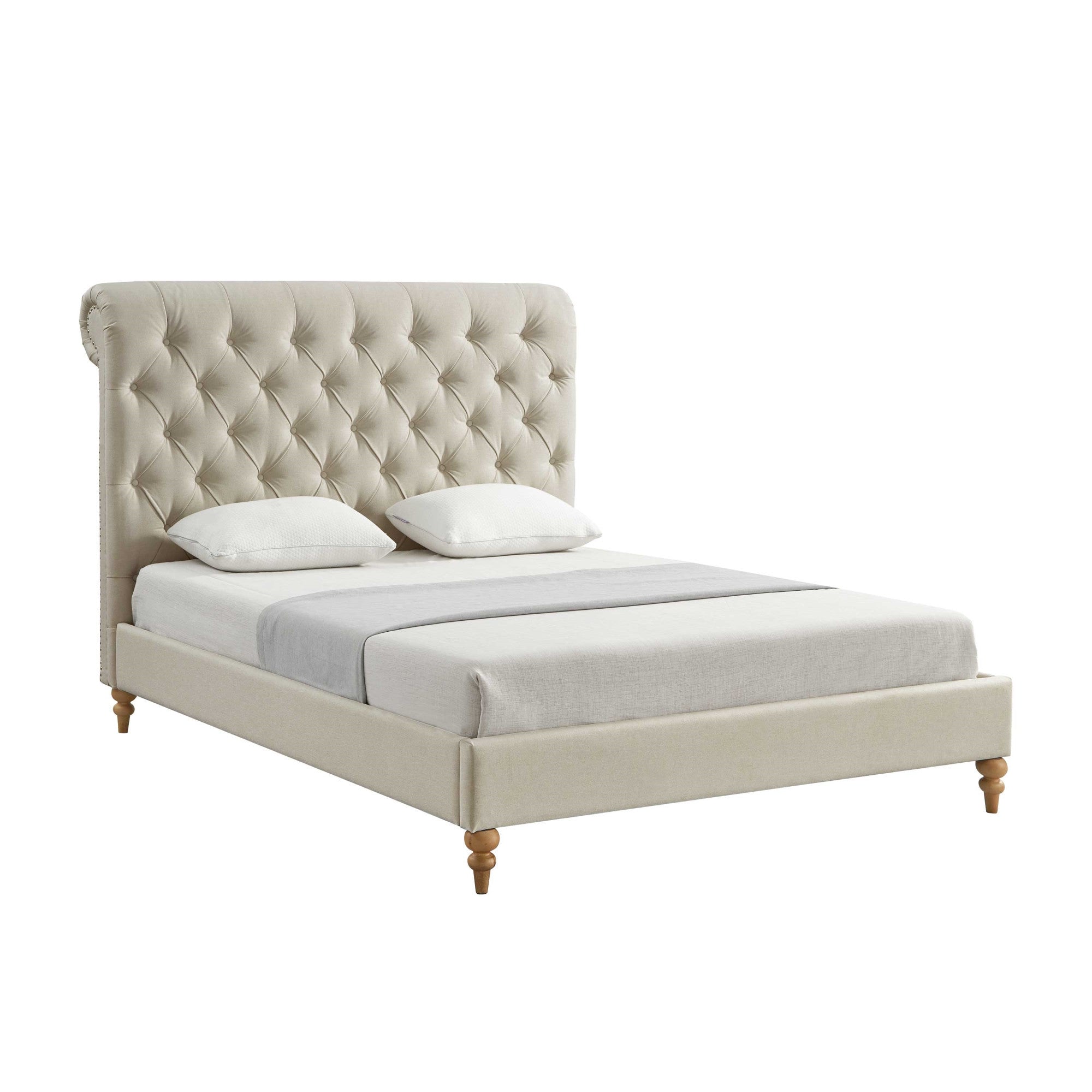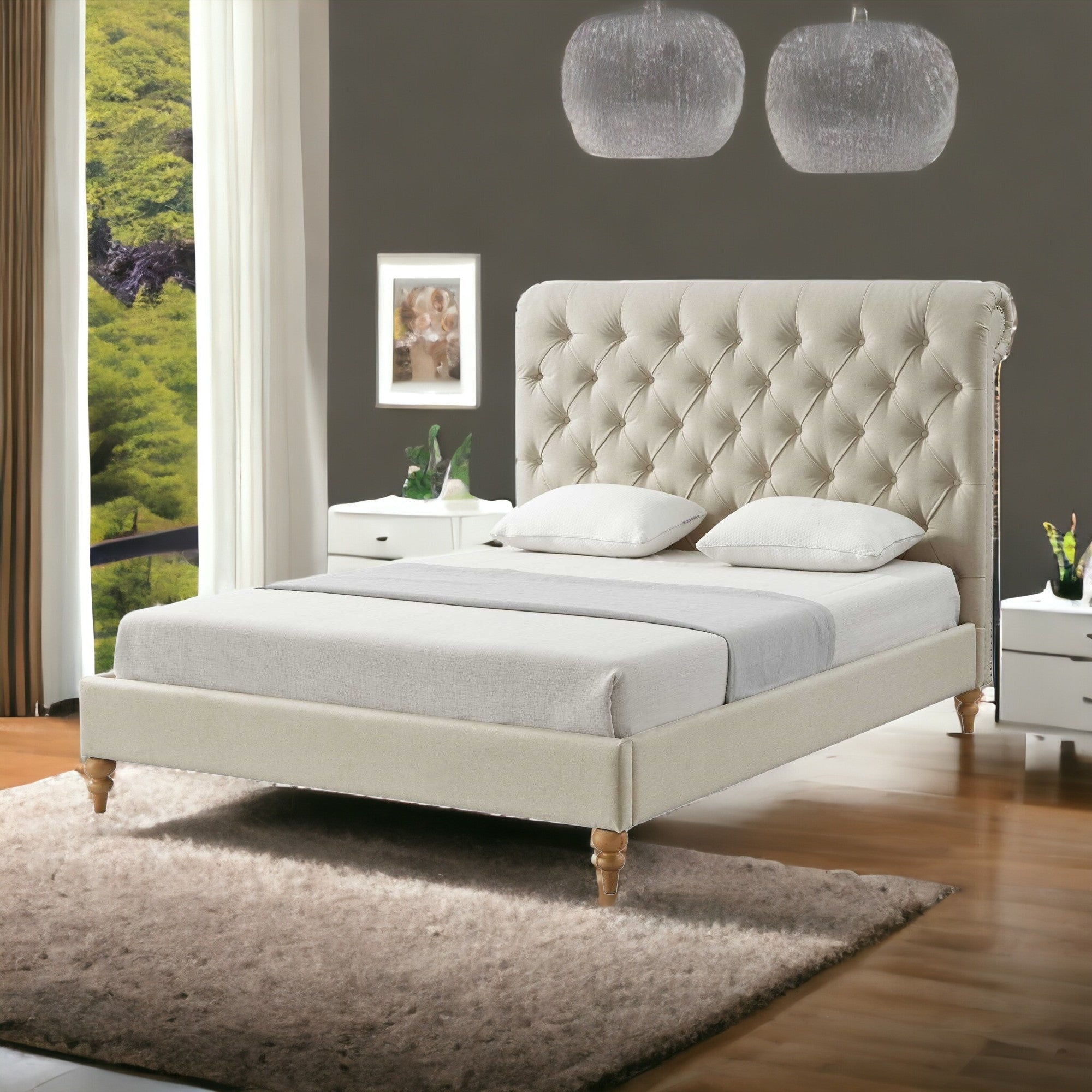 - Fully upholstered beige bed with a rectangular panel headboard.