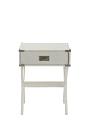 - Modern Black Campaign style end or accent table with nickel finish hardware accents.