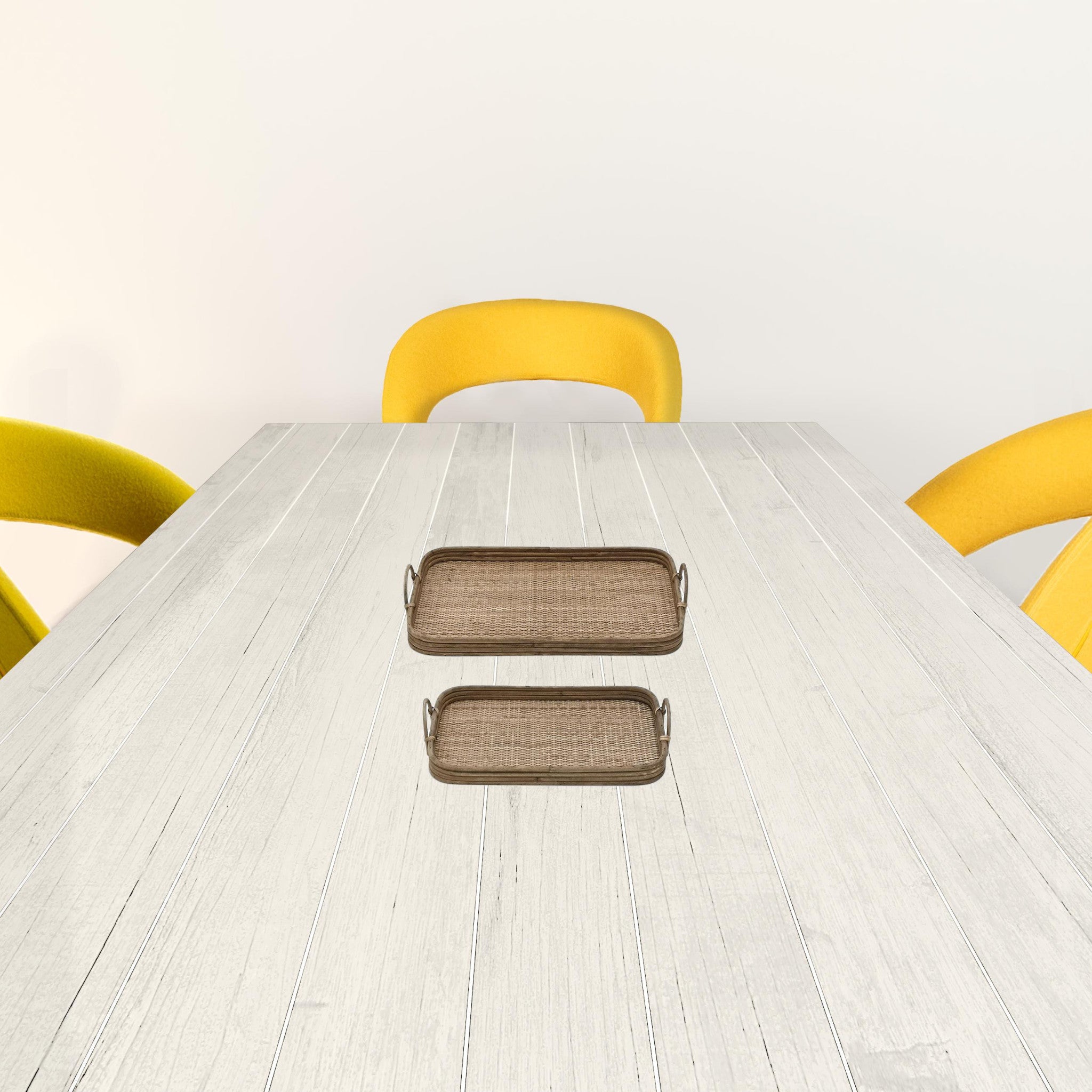 - Set of 2 country-style rectangular rattan serving trays with handles. Perfect for serving food and beverages.