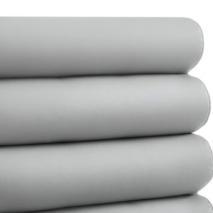 - Modern Side Dining Chair in Channel stitched Gray Faux Leather Upholstery with Steel Legs.