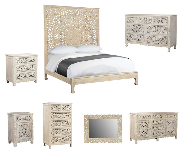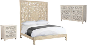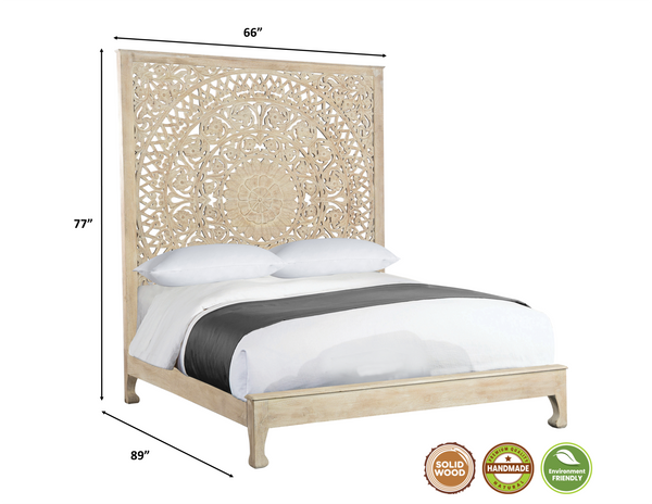 - Bohemian carved floral distressed natural with white wash solid wood bed frame with decorative headboard.