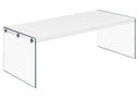 - Sleek and modern coffee table with a clear glass base and a white manufactured wood top.