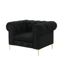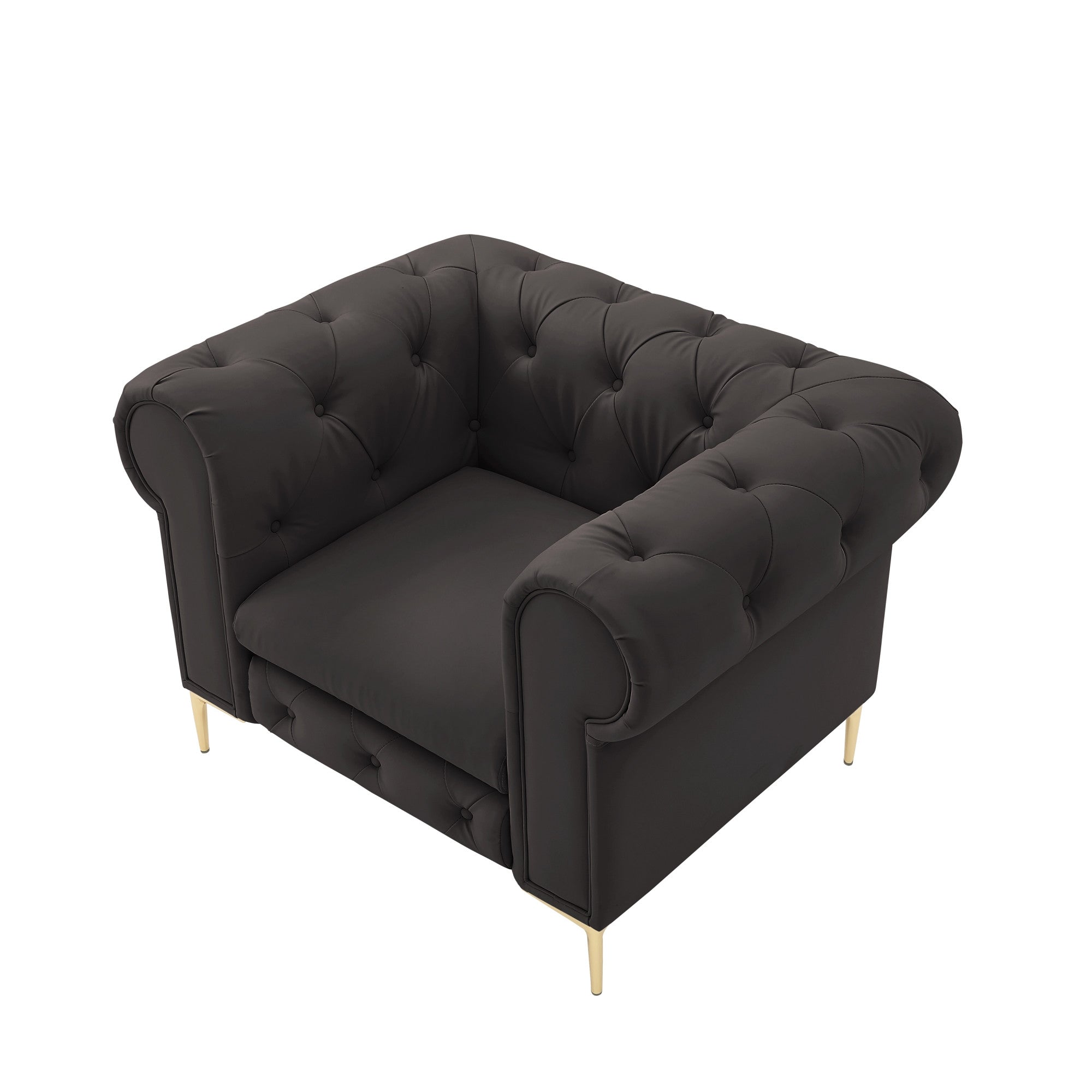 - Chesterfield-style accent chair with a luxurious faux leather upholstery in black.