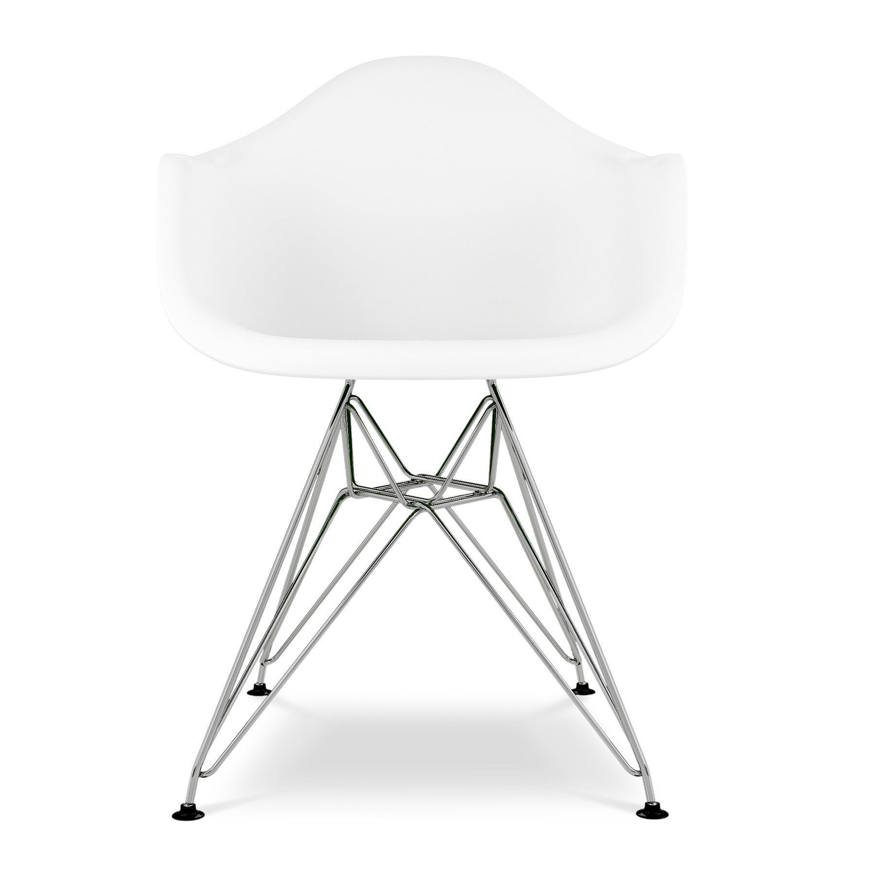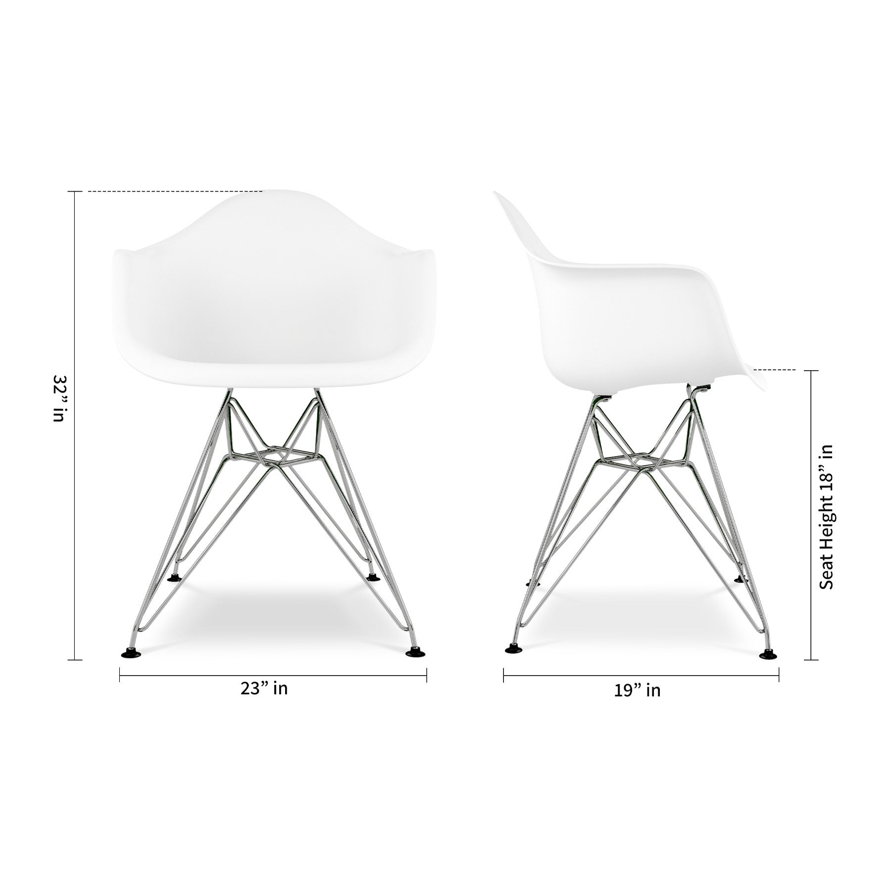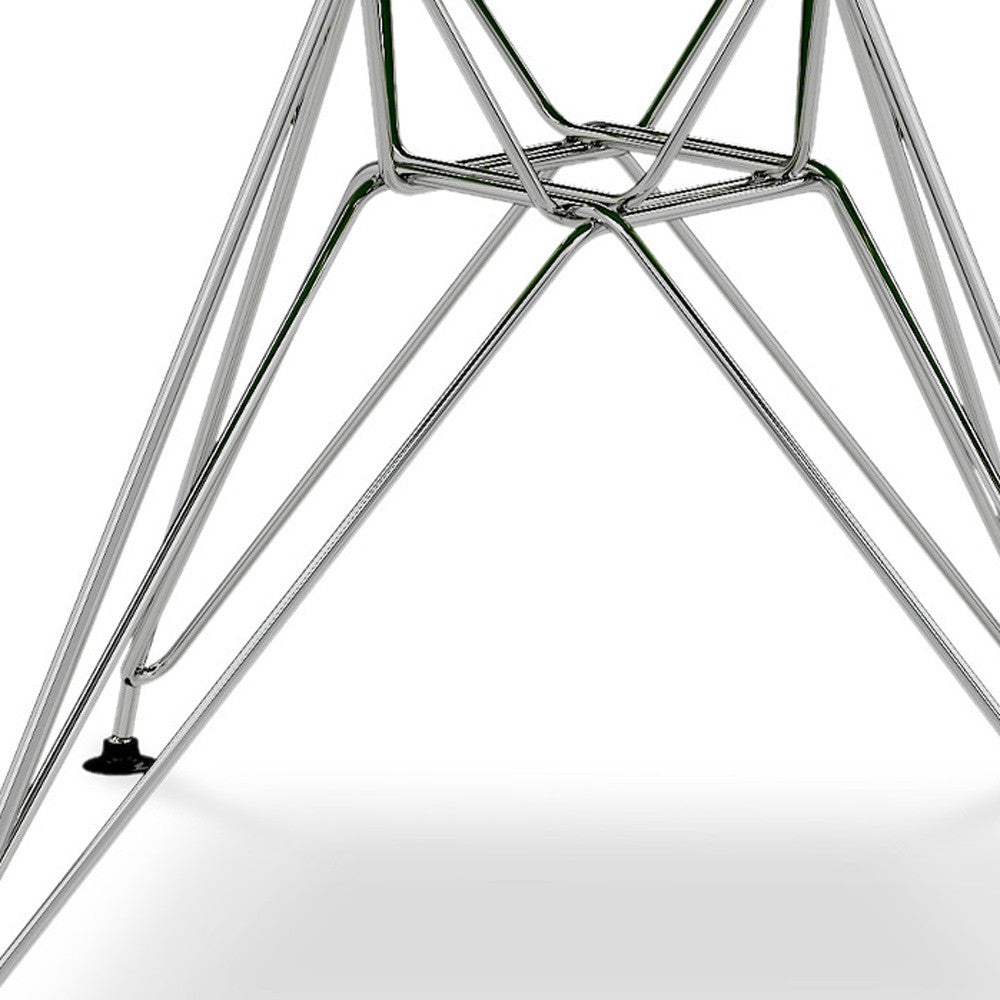 - Modern chic and timeless heavy duty plastic chair with open geometric silver chrome legs.
